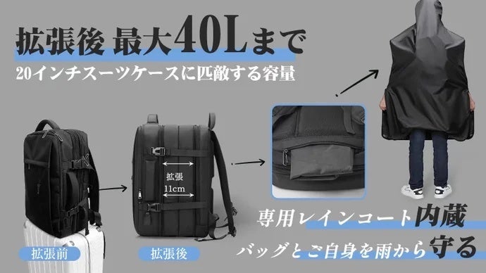容量拡張で普段使いと旅行用が兼用できる多機能バックパック!専用レインコート付をMakuakeにて先行販売開始!