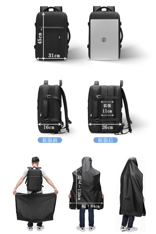 名称:容量拡張可能多機能バックパック(レインコート付)