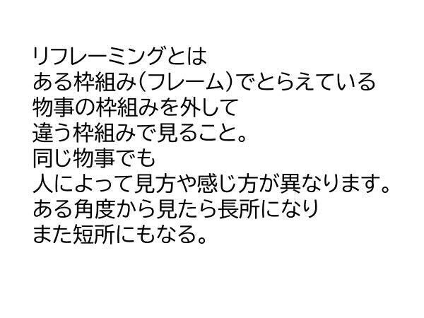 リフレーミングとは、ものごとの捉え方を変え、違う視点から見ることです。