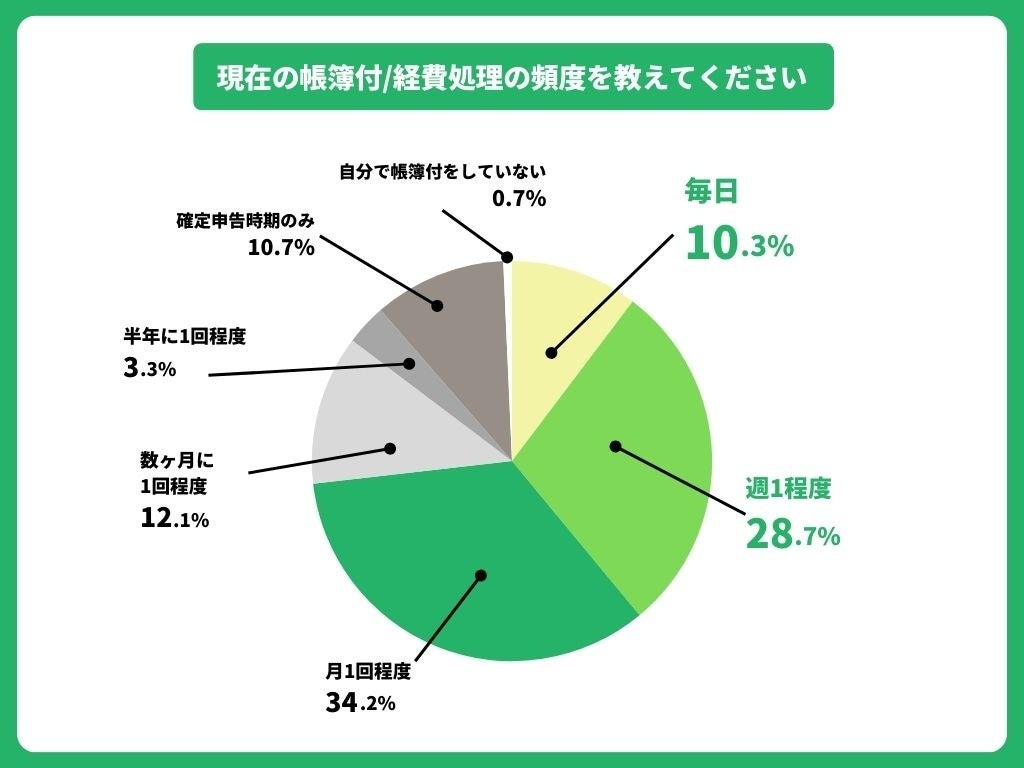 そこで、実際の帳簿付け/経費処理の頻度について尋ねました。すると、帳簿付け/経費処理を頻度高くした方が良いと思う人は85.5%に対して、毎日(取引が発生する度に)実施できているのは10.3%と、75.2%のギャップがあることがわかりました。