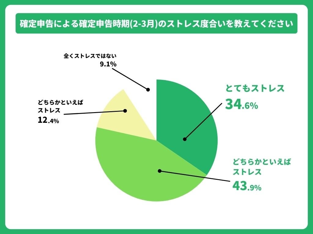 確定申告の時期が近づくと、多くの個人事業主や自営業者の方々が大きなストレスを感じていることがわかりました。実際に本調査でも、約80%の方が確定申告時期にストレスを感じると回答しています。