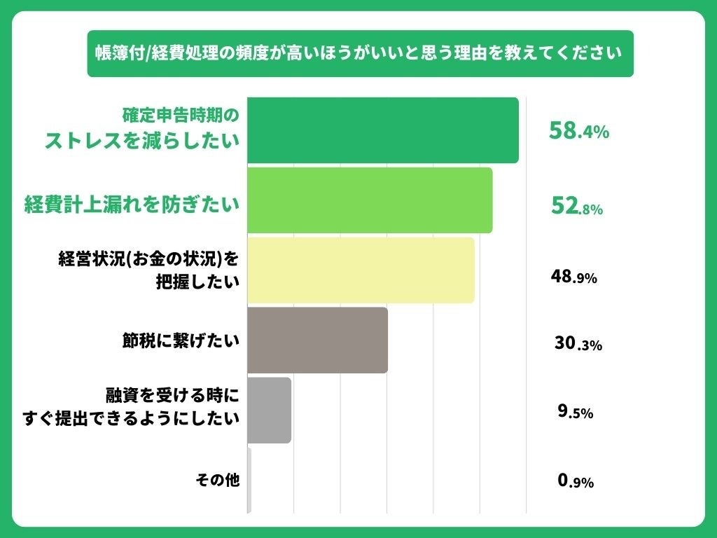 そこで、なぜ頻繁に帳簿すべきだと思うかについて尋ねました。すると、最も回答が多かったのは確定申告時期のストレスを減らしたいため(58.4%)でした。ついで経費の計上漏れを防ぎたい(52.8%)、経営状況/お金の状況を把握したい(48.9%)などが続きます。
