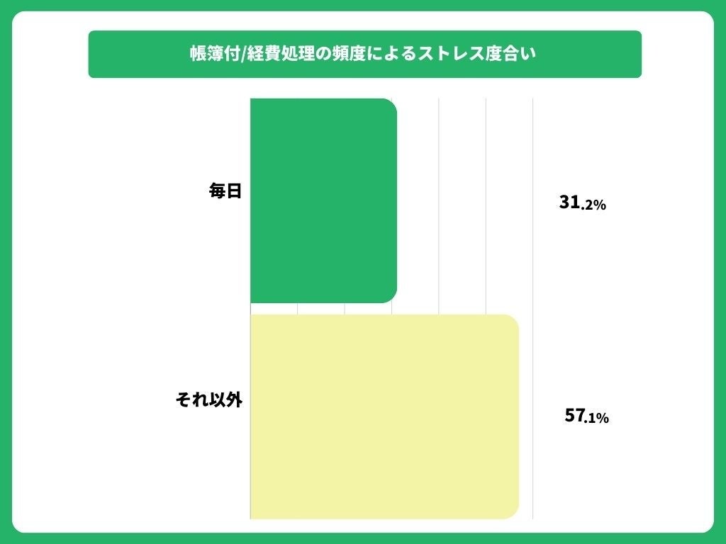 続いて、ストレスと帳簿付けの関係について調査しました。毎日帳簿付け/経費処理を行う人のストレス度合いは31.2%なのに対し、それ以外の頻度で帳簿付け/経費処理を行う人のストレスは57.1%と、2倍近くに上ることがわかりました。