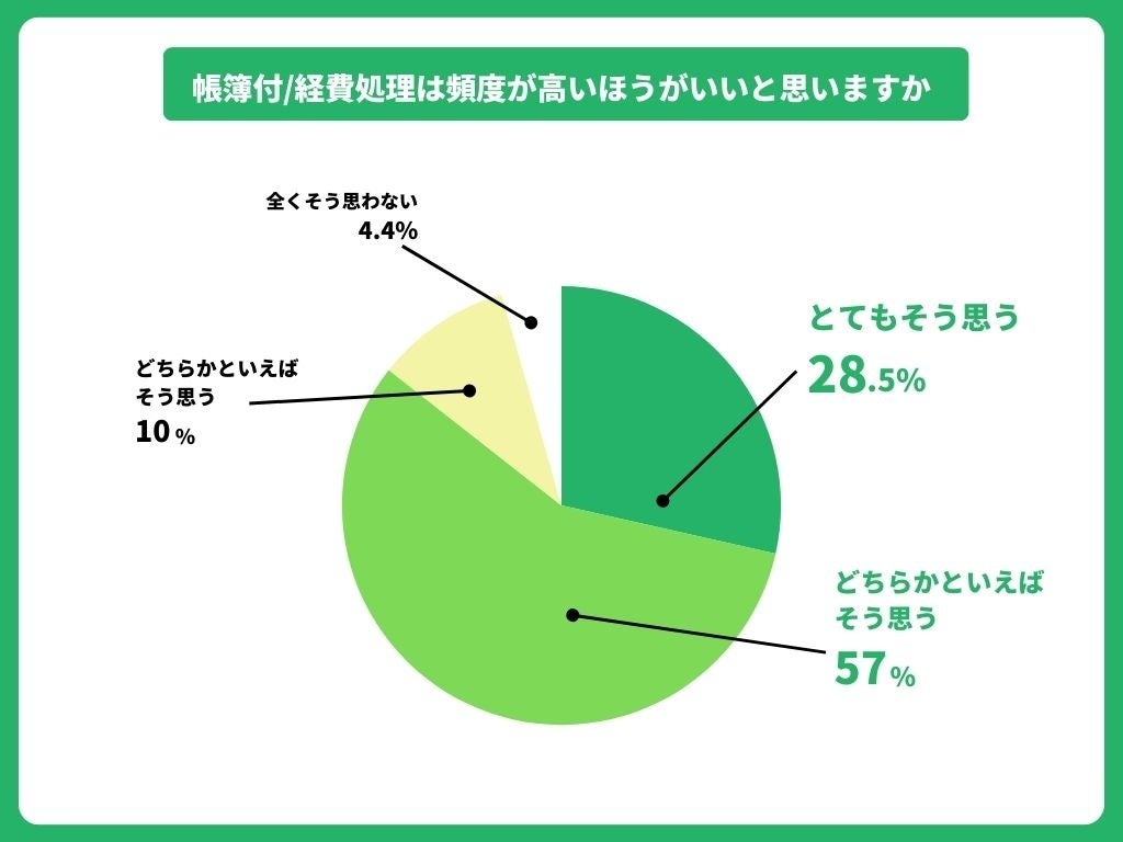 はじめに、頻繁に帳簿付けすべきかどうかについて尋ねました。回答結果から、帳簿付け/経費処理を頻度高くした方が良いと思う傾向にある合計数は85.5%に上ることがわかりました。大多数が日々の帳簿付けの重要性を認識しているようです。