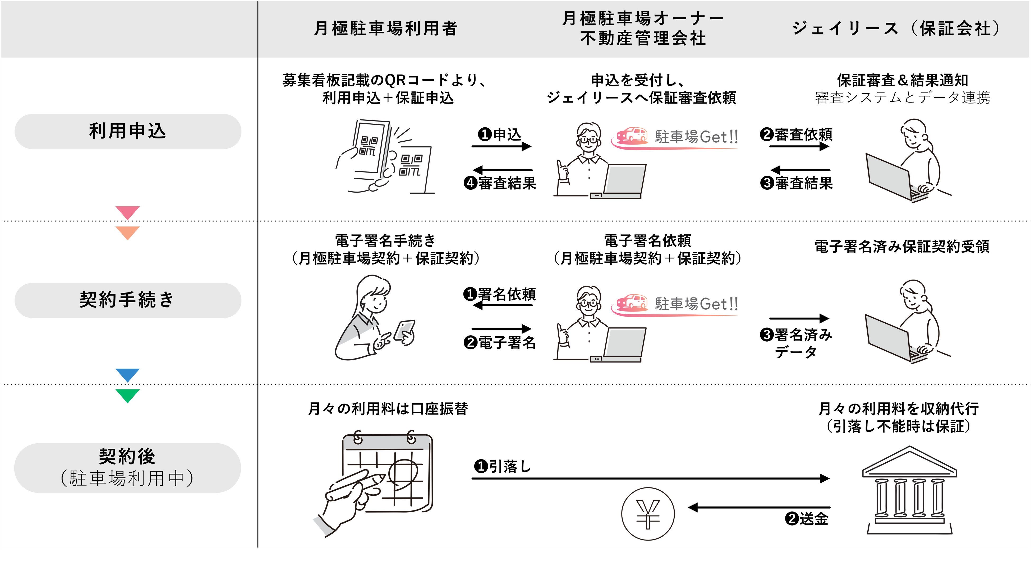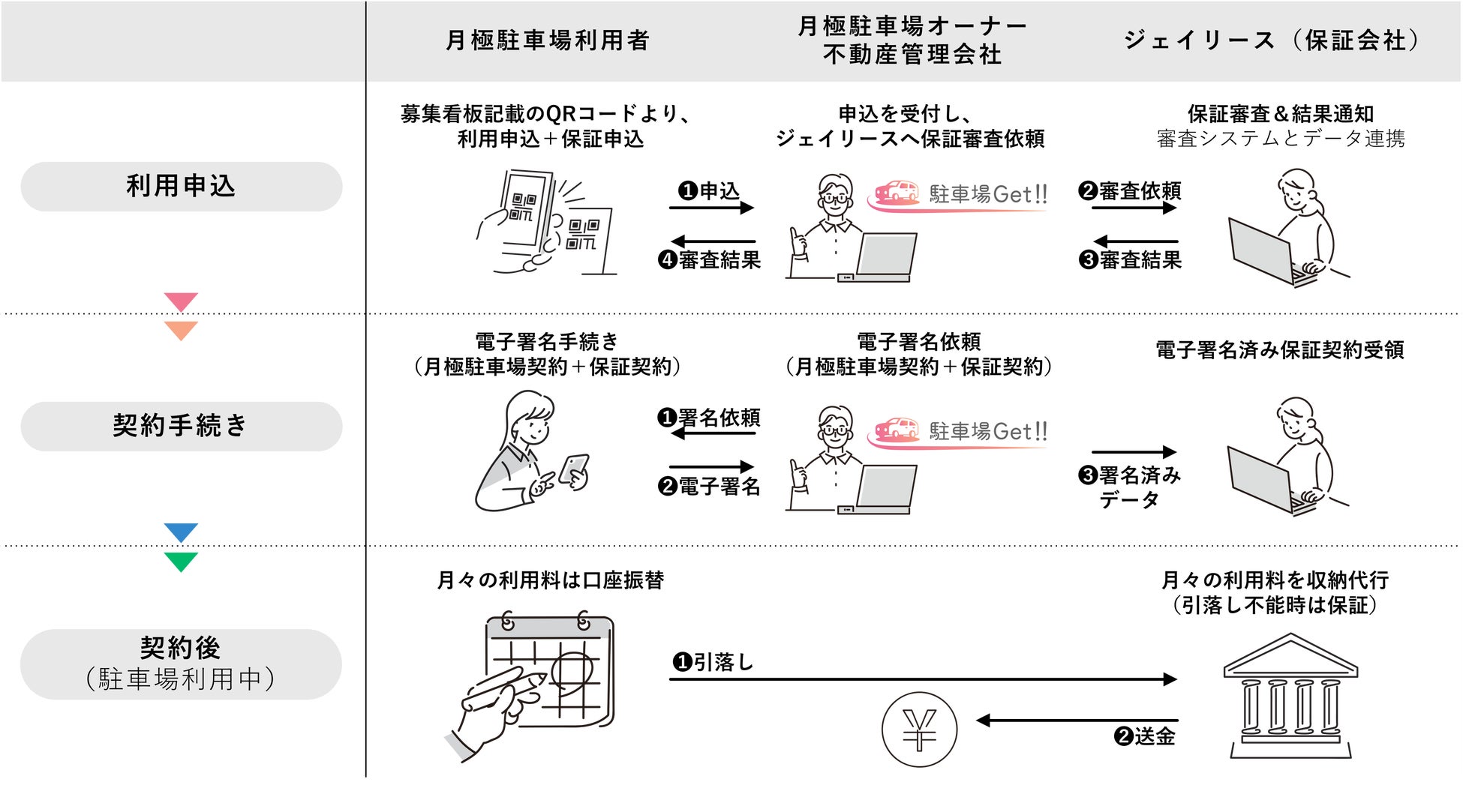 「駐車場Get‼」は、月極駐車場の利用申込受付から契約までの手続きをオンライン上で完結できるクラウドシステムです。「駐車場Get‼」を導入することで来店対応や書類の郵送手続きが不要となり、さらに当社が契約後の月極駐車場の月額使用料を収納代行・保証することで、申込から契約管理までシームレスな業務プロセスを実現し、駐車場オーナー・不動産会社の業務効率向上に寄与いたします。