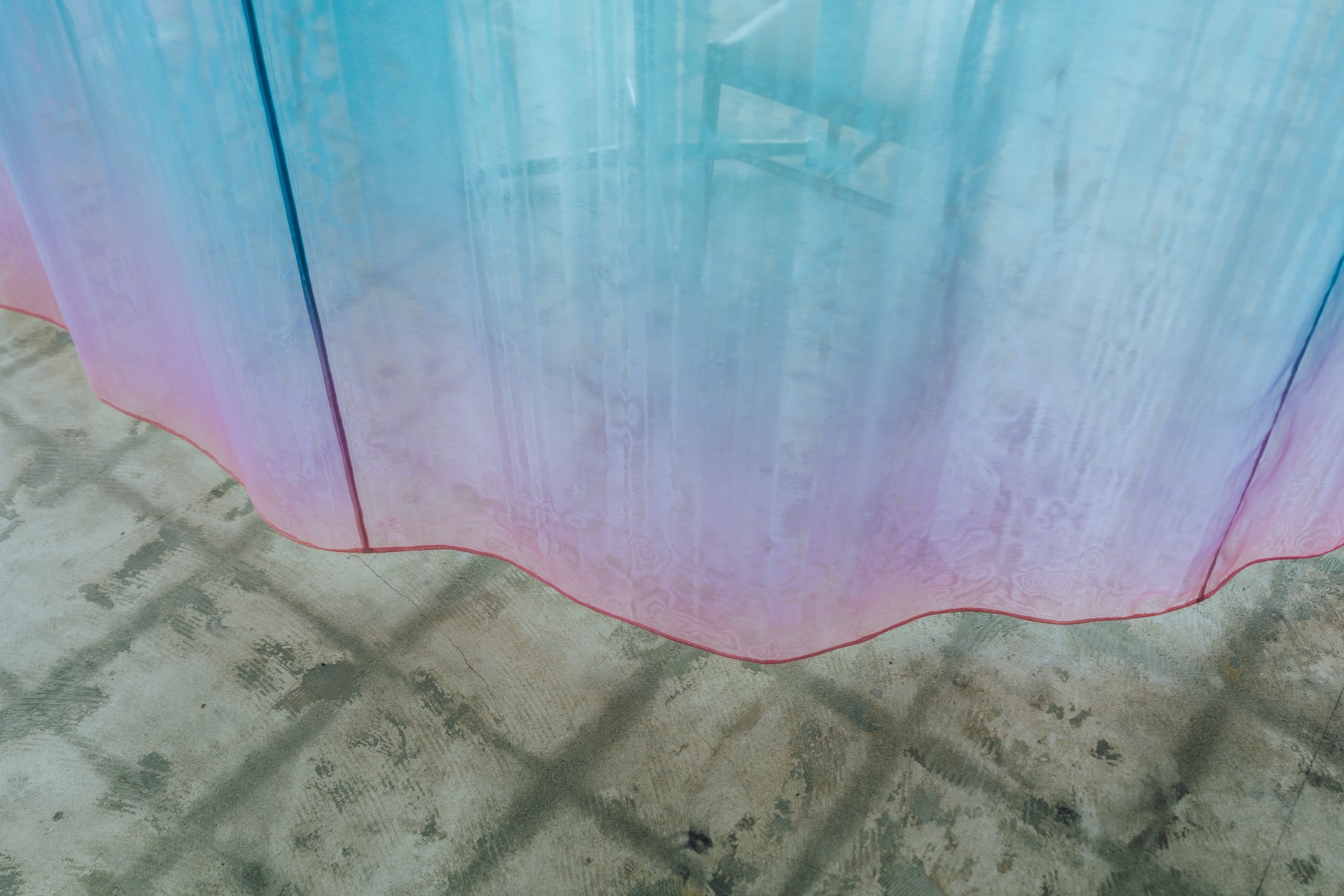 秋田県男鹿市は風も強く冬の気候は厳しいため、窓の前に空気層としてのバッファーゾンを用意することにしました。それは海の泡のように館内にもたくさん派生し、曲線を描いてフワフワと空間の中に現れ、柔らかい場を演出します。素材も不透明だったり半透明のものだったり、布だったりとすることで、さらに多様な空間を生んでいます。滞在する旅行者がここで心身ともに癒されてほしいと思いました。