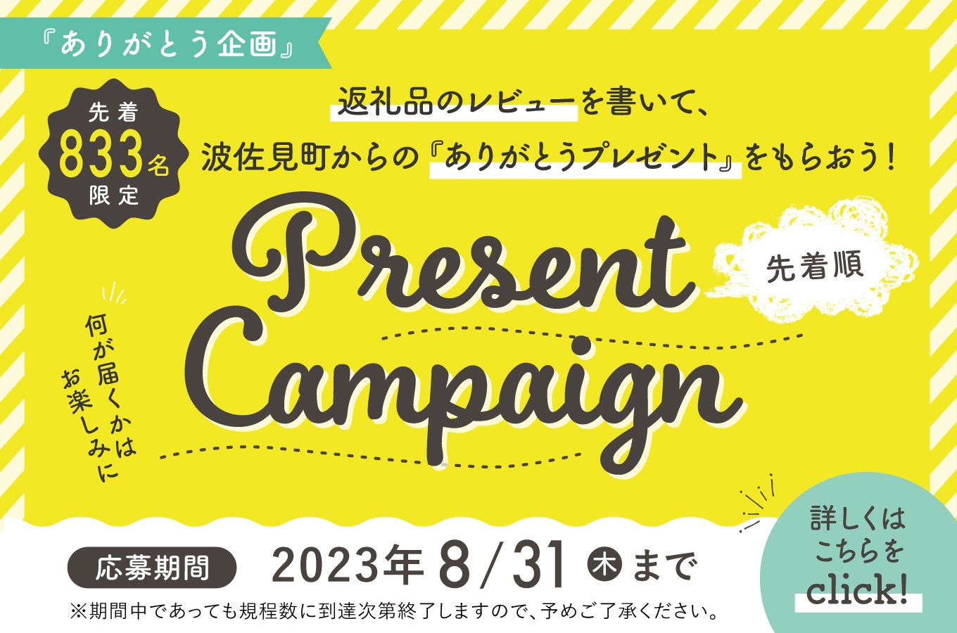 先着833名!返礼品のレビューを書いて『ココロばかりのありがとうプレゼント』をもらおう!