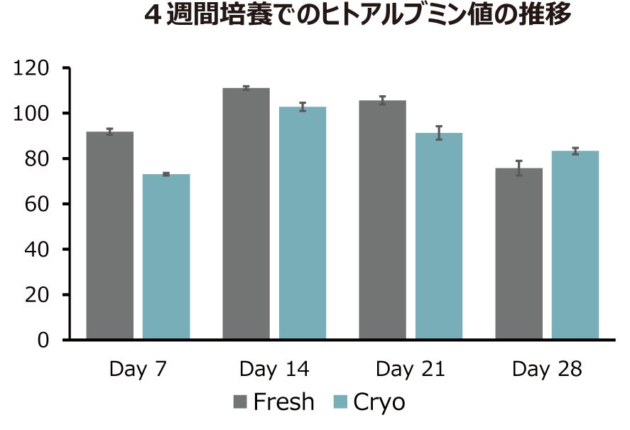新製品「PXB-cells Cryo」は、ヒト肝細胞キメラマウスから採取した新鮮なヒト肝細胞を当社独自の方法で機能を損ねることなく凍結した新たな供給形態の製品です。この凍結ヒト肝細胞は新鮮ヒト肝細胞「PXB-cells」と比較しても、接着性や形態は遜色なく、長期培養も同様に可能であり、さらにアルブミン産生能、CYP mRNA発現やトランスポーター機能も高く維持されています。