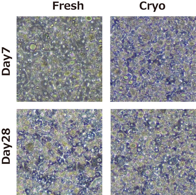 上記の機能面の他、凍結することで長期保存が可能となり、一定数をまとめてご購入いただくことで海外輸送時のコスト軽減が図れること、また、ストックされた凍結ヒト肝細胞を研究者の方のご都合にあわせて試験に使用できるため、従来の新鮮PXB-cellsとあわせて創薬研究者の方の多様な用途に対応できるものと考えています。