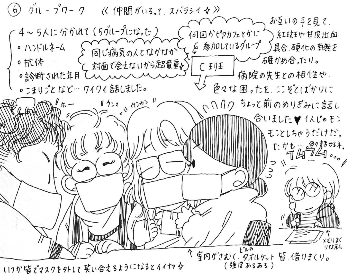 ピアカフェは患者同士が、5つのグループに分かれ、自己紹介(抗体や診断年、困りごとなど)やご自身の体験談などを共有しました。