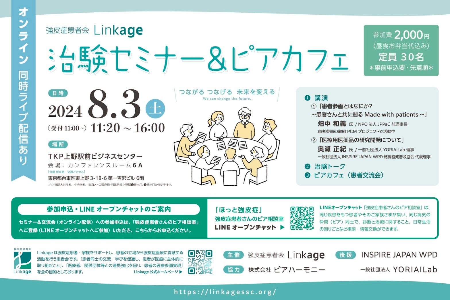 強皮症患者会Linkageは、株式会社ピアハーモニーの協力のもと、2024年8月3日に「治験セミナー&ピアカフェ」を開催しました。本イベントは、Linkageの発足を記念し、患者参画の重要性を学ぶ場として企画されました。治験に関する理解を深める講演や患者同士の交流を通じ、会場とオンラインで合計31名の参加者が新たな希望を見出しました。