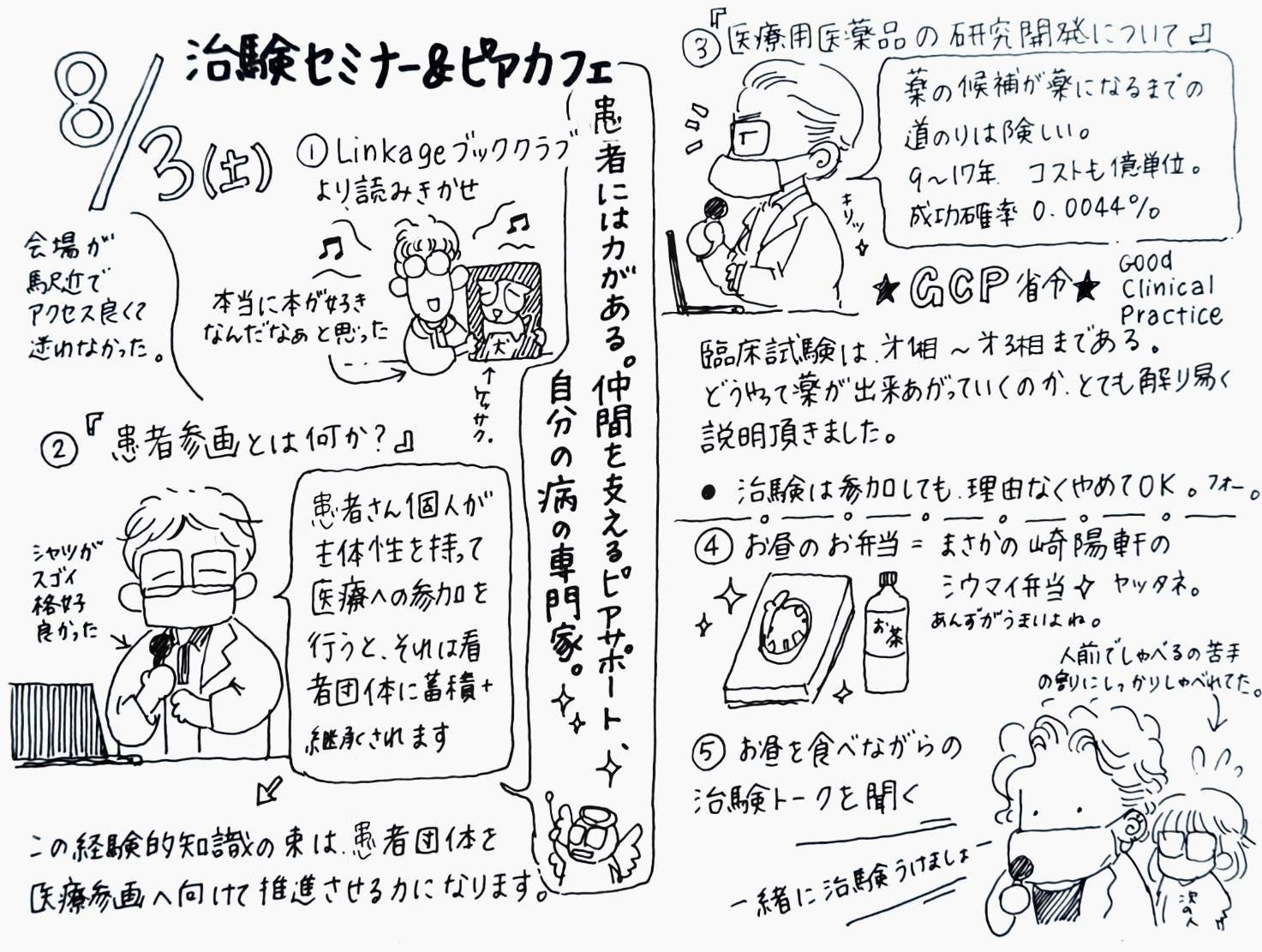 治験セミナーや治験トーク、ピアカフェの様子は、Linkage会員メンバーである山田花子氏がまとめてくれました。