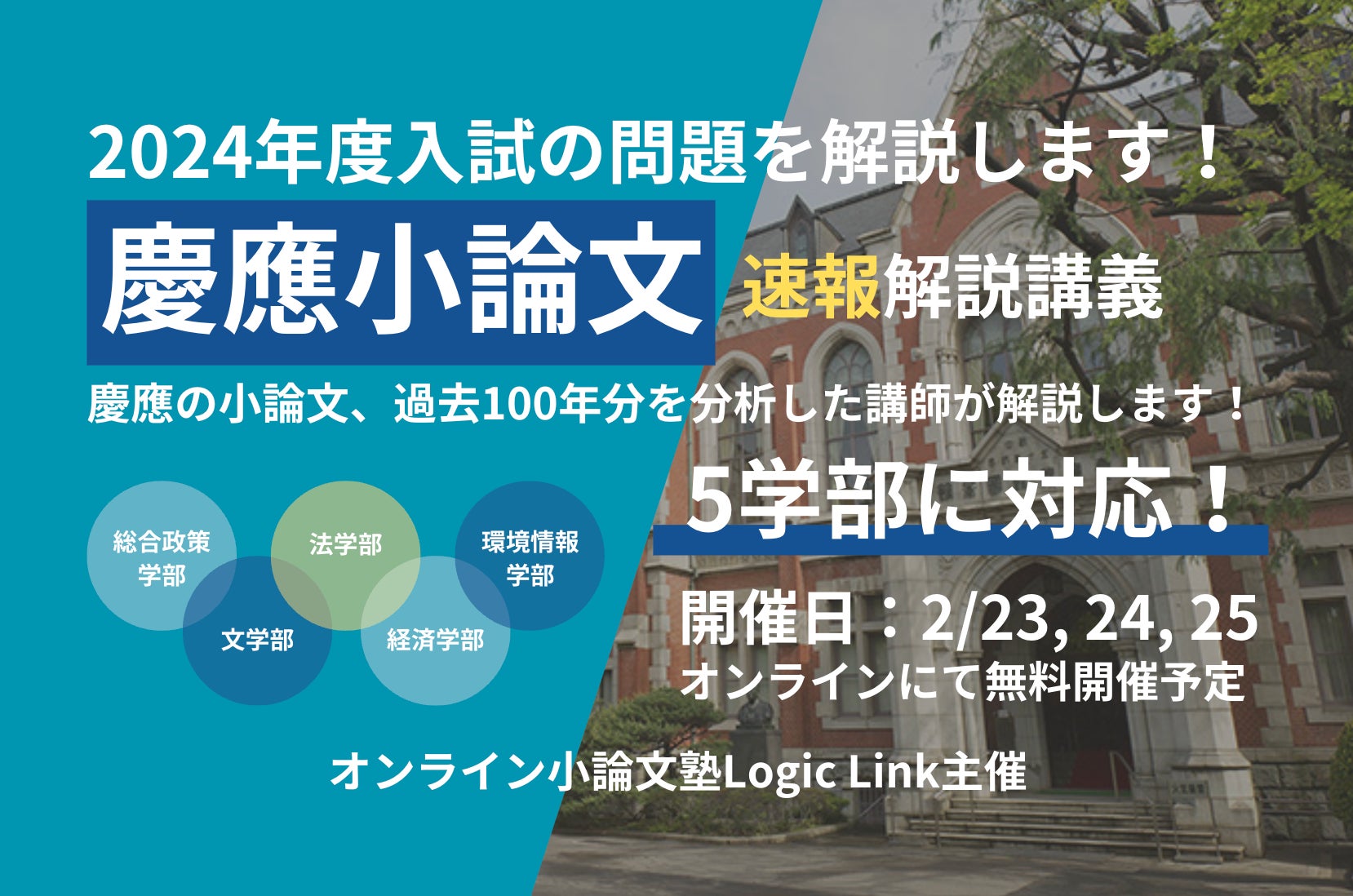 株式会社Logic Linkが運営するオンライン小論文塾Logic Linkが、【慶應義塾大学2024年度入試、小論文学部別速報解説講義】を開催します。参加者随時募集中です。