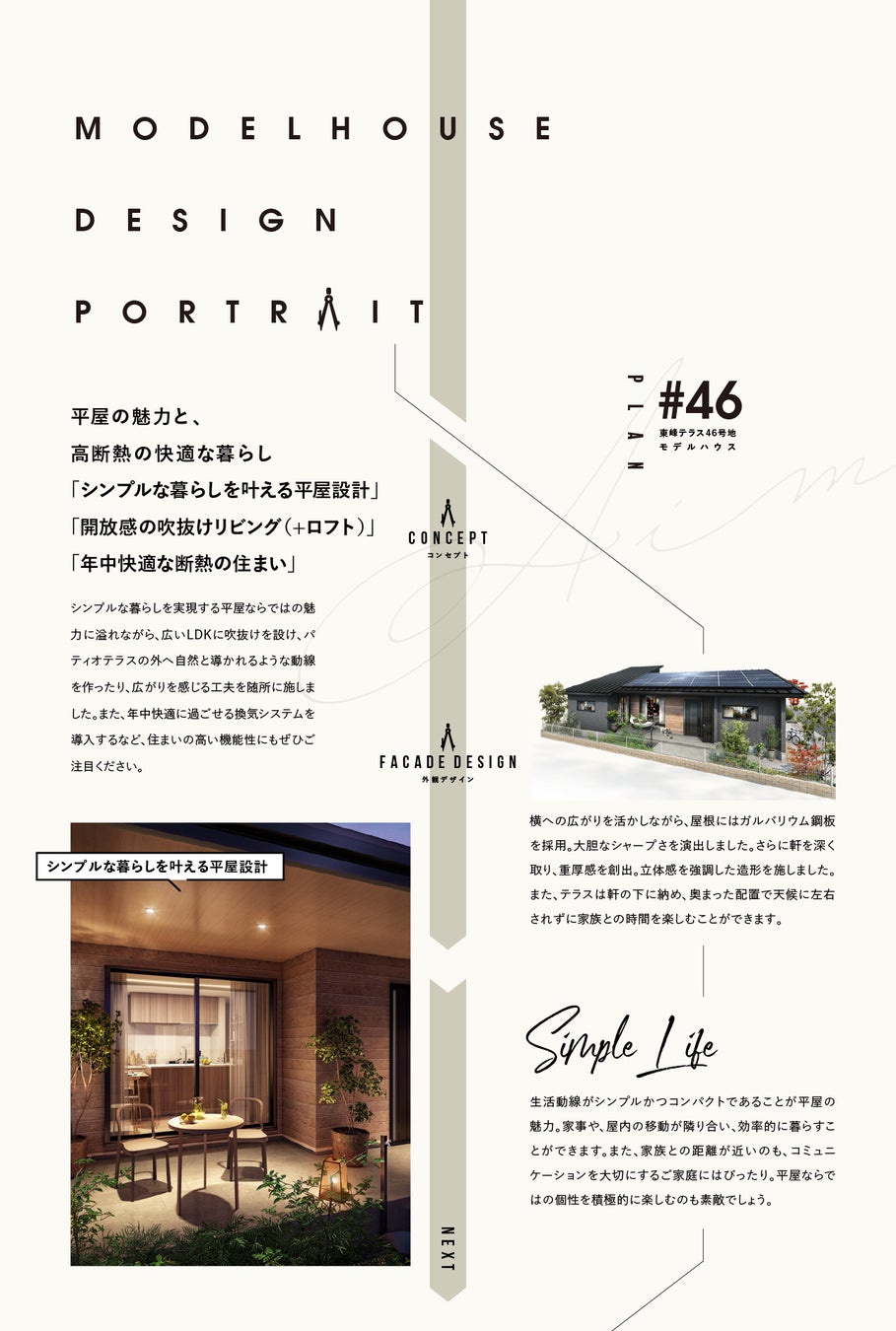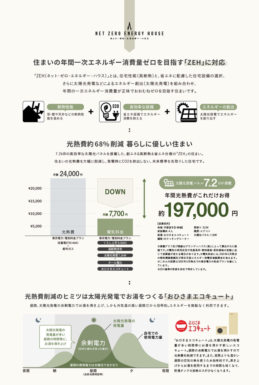 グランディハウス株式会社(本社:宇都宮市 代表取締役社長:佐山 靖)は、大型分譲地「東峰テラス」にて、ZEH水準である断熱等級5を超えた断熱等級6のモデルハウスを建築いたしました。2025年度に義務化となる断熱等級4と比較して基準エネルギー消費量を30%以上削減、UA値(W/㎡K)=0.46以下の断熱性能となっており、7.2KWの太陽光を搭載・おひさまエコキュート・第1種熱交換換気システム・樹脂サッシを採用し光熱費を68%削減し「暮らしにやさしい住まい」としております。また、当モデルは、シンプルな暮らしを叶える平屋設計とし開放感ある吹抜けリビング(+ロフト)・パティオテラス・ランドリールームを配置し住み心地にこだわり設計いたしました。(設備詳細等は、別紙参照)