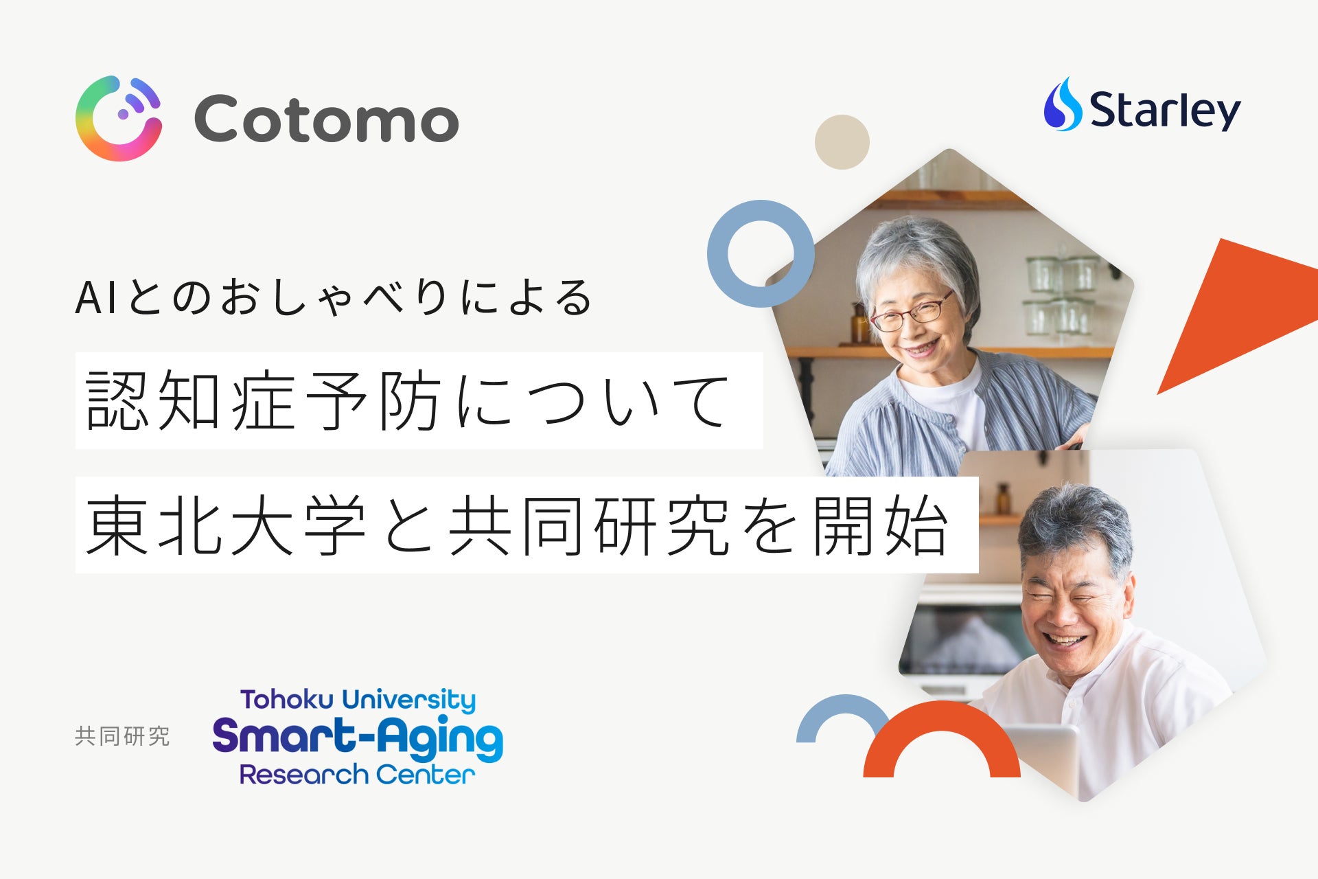 そこで、Starleyがすでにリリースしている「Cotomo」の技術を応用し、シニアとAIのおしゃべり体験が認知症予防にもたらす効果について、東北大学スマート・エイジング学際重点研究センターと共同研究を実施いたします。