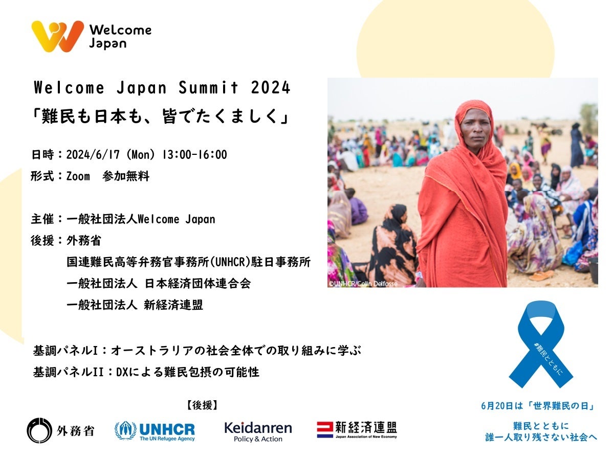 日本社会全体による多様な難民包摂の拡充に向けた中間支援組織 一般社団法人Welcome Japanは、世界難民の日(6月20日)を控えた2024年6月17日(月)に「Welcome Japan Summit 2024」を開催いたします。