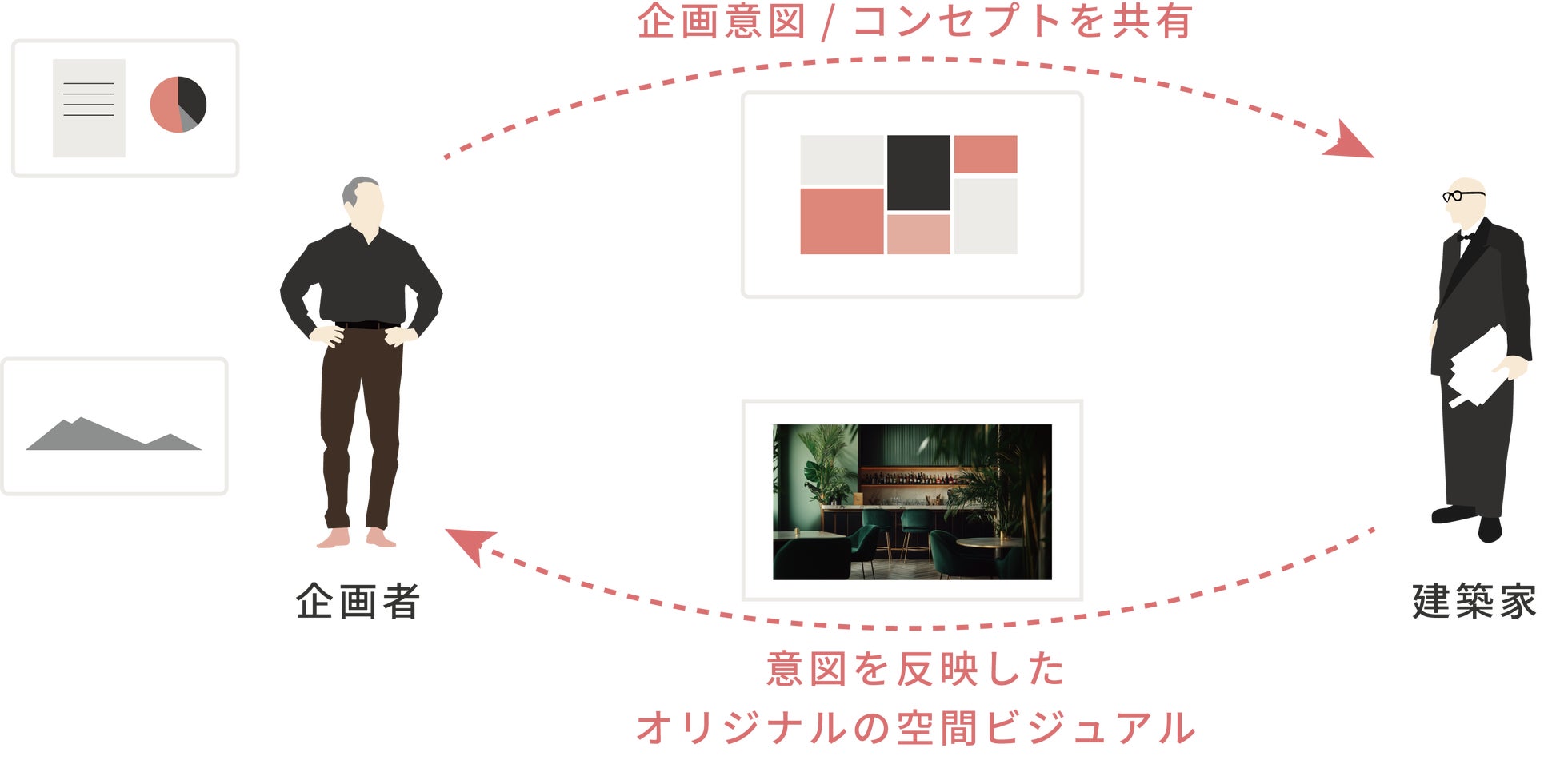 建築家の「空間を創造する力」は、施主の要望や社会の動向を踏まえて最適なかたちを考案する能力です。これまでは主に設計の現場で発揮されてきましたが、本サービスでは企画段階でその力を活用することで、「空間を創造する力による事業価値の創造」を目指しています。