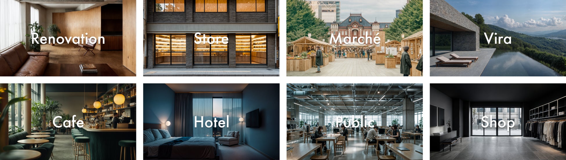 アパレルや文具などの商業店舗、飲食店やホテルなどの体験施設、オフィスビルや戸建て住宅などの新築物件、あらゆる不動産のビジュアル化に対応いたします。