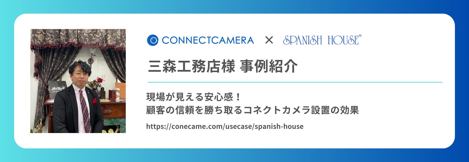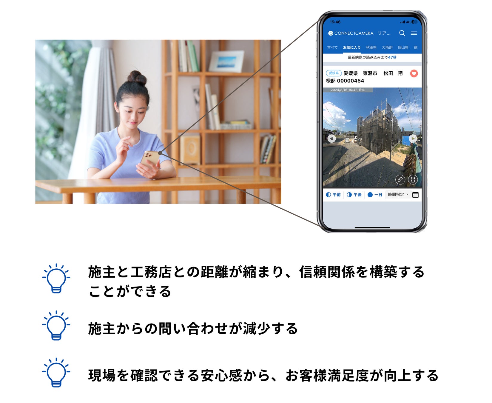 コネクトカメラで撮影した映像を施主に共有することで、お客様との信頼関係の構築、お客様の満足度を向上することができます。