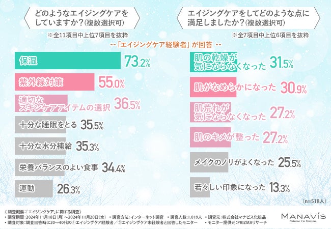 保湿や紫外線対策、適切なスキンケアアイテムを選ぶなど、基本的なスキンケアが多くのエイジングケア経験者に実践されていることが示されました。