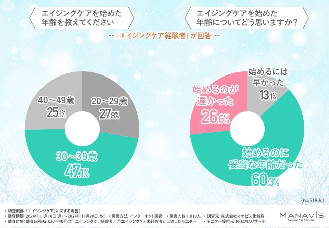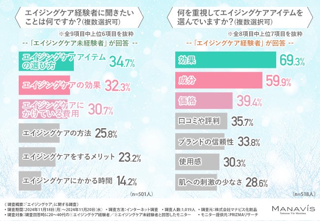 株式会社マナビス化粧品(所在地:千葉県浦安市、代表取締役社長:兼子 慎一)は、20〜40代の①エイジングケア経験者/②エイジングケア未経験者を対象に、「エイジングケア」に関する調査を実施しました。