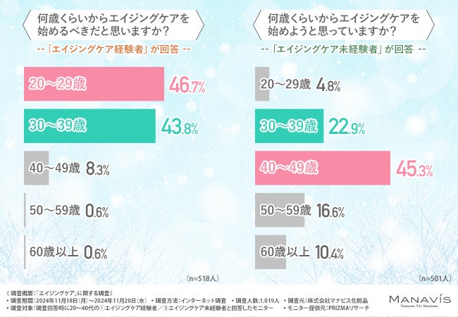 経験者は20代後半から30代前半でエイジングケアを始めるべきだと考えている一方、未経験者は40代前後から始めようと考えている傾向が明らかになりました。