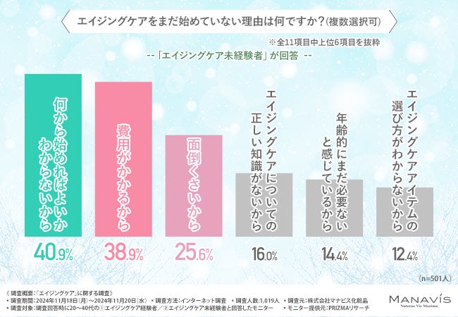 エイジングケアは早い時期から始めることを推奨する経験者が多いようですが、未経験者がはじめられていない理由はどんなものがあるのでしょうか。