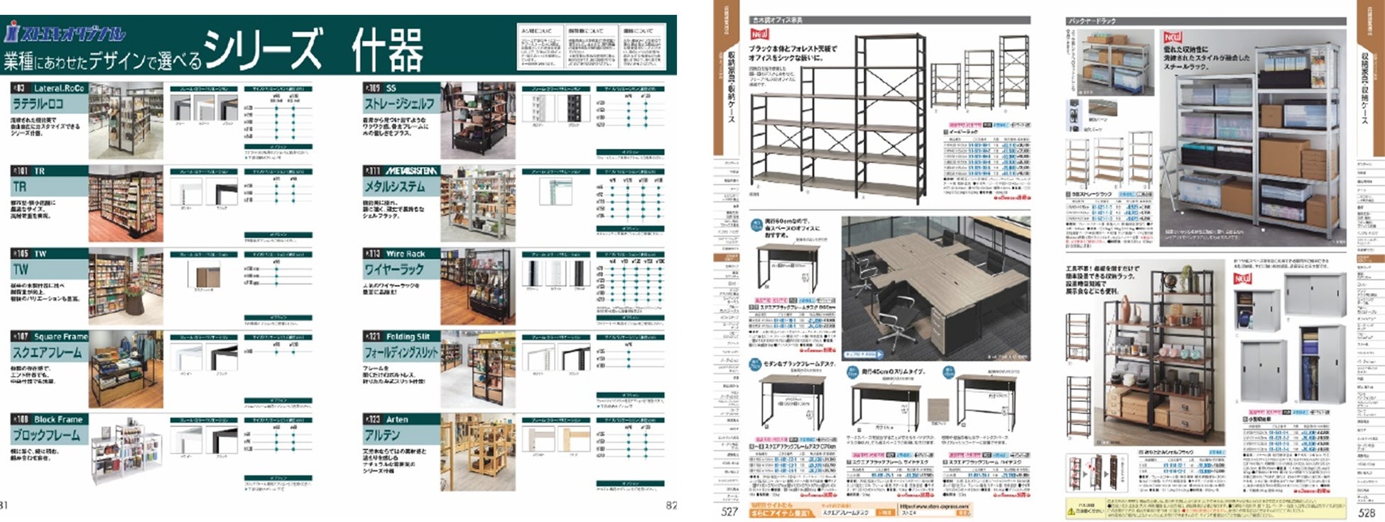 当社は、アパレル・雑貨店・量販店など小売店に加え、近年ではオフィスや事務所、飲食業、サービス業など多様な業種からの引き合いが増加しています。総合カタログ40号では、こうしたトレンドも反映して、当社の主力商品である什器シリーズのオプション商材と、店舗バックヤードやオフィス家具カテゴリーの拡充をメインとし、多様な用途に対応する新商品、約1,800点を展開します。