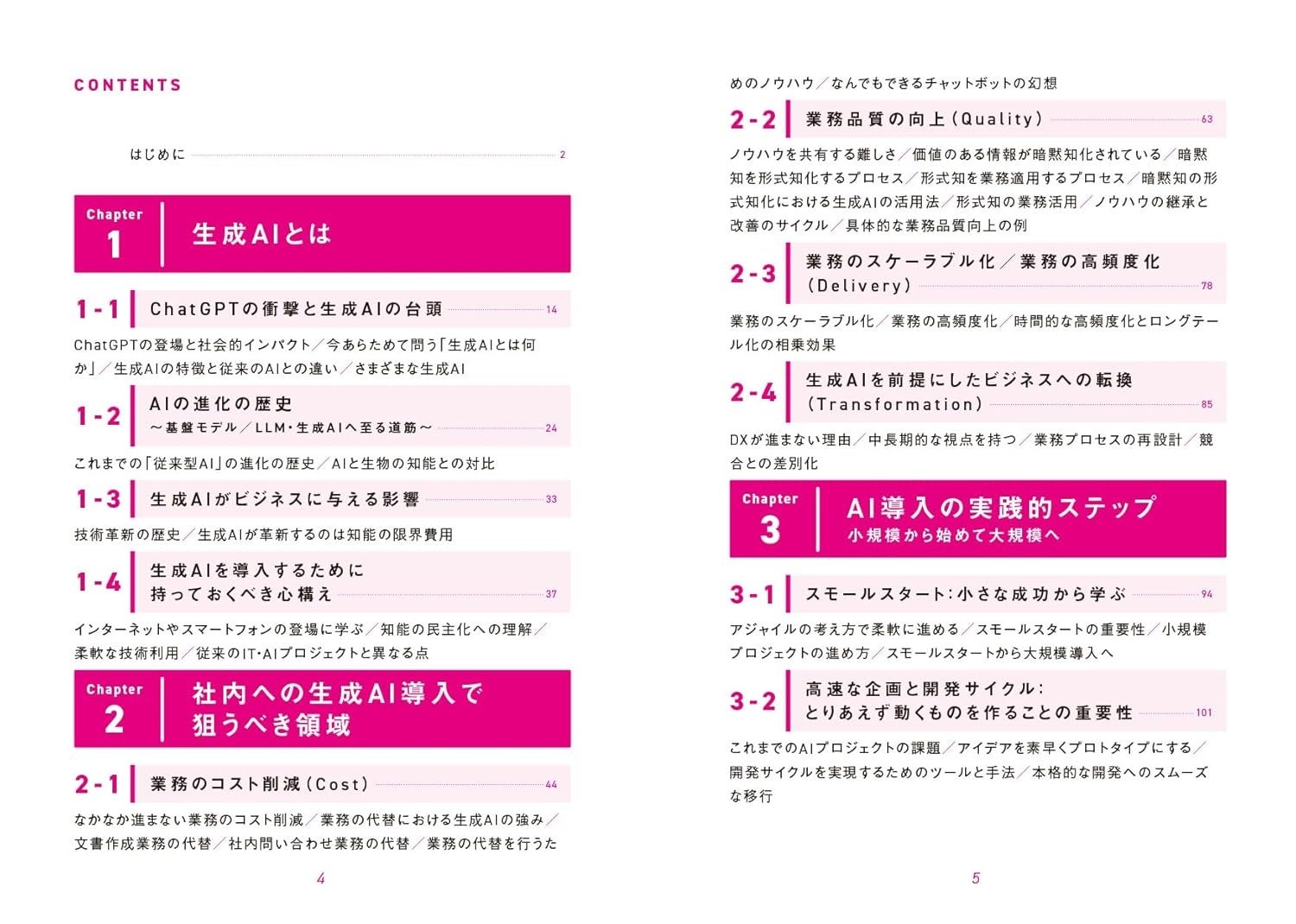 本書の前半では、生成AI導入を積極的に進めるべき具体的な社内業務の解説のほか、導入フロー、リスク管理、プロジェクトマネジメントなどについて紹介。後半では、製造業や金融、製薬・ヘルスケア、不動産など多彩な業種・職種における生成AI活用事例を一つ一つ丁寧に解説します。
