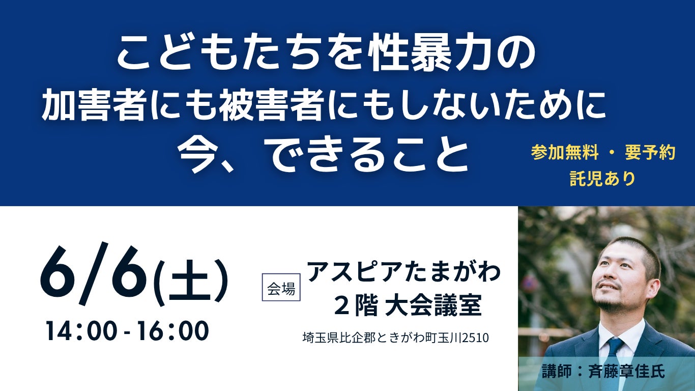 性教育の普及啓発活動を行うNPO法人にじの絲(埼玉県ときがわ町)は、加害者臨床で現在まで3500名以上の性犯罪加害者の治療に関わる斉藤章佳氏を講師に迎え、6月6日土曜日 埼玉県ときがわ町にて【こどもたちを性暴力の加害者にも被害者にもしないために 今、できること】講演会を開催します。