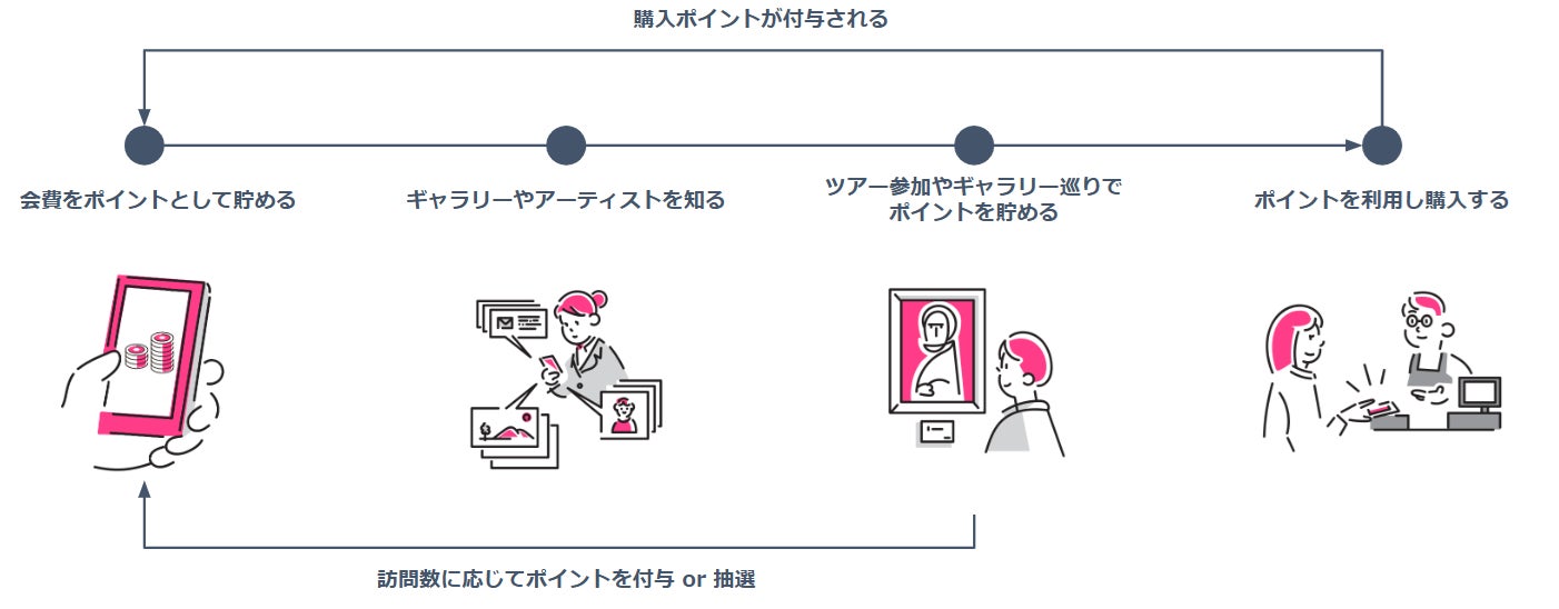 Funwow.artは、こうした課題を解決するために、ポイントというデジタルな仕組みを活用し、厳選したギャラリーを紹介するとともに、会員限定のギャラリーツアーやアーティストトークなど、気軽に参加できる体験型のイベントを提供します。これにより、初心者でも安心してギャラリーを訪れながら、作家や作品とのつながりを深める機会を創出します。