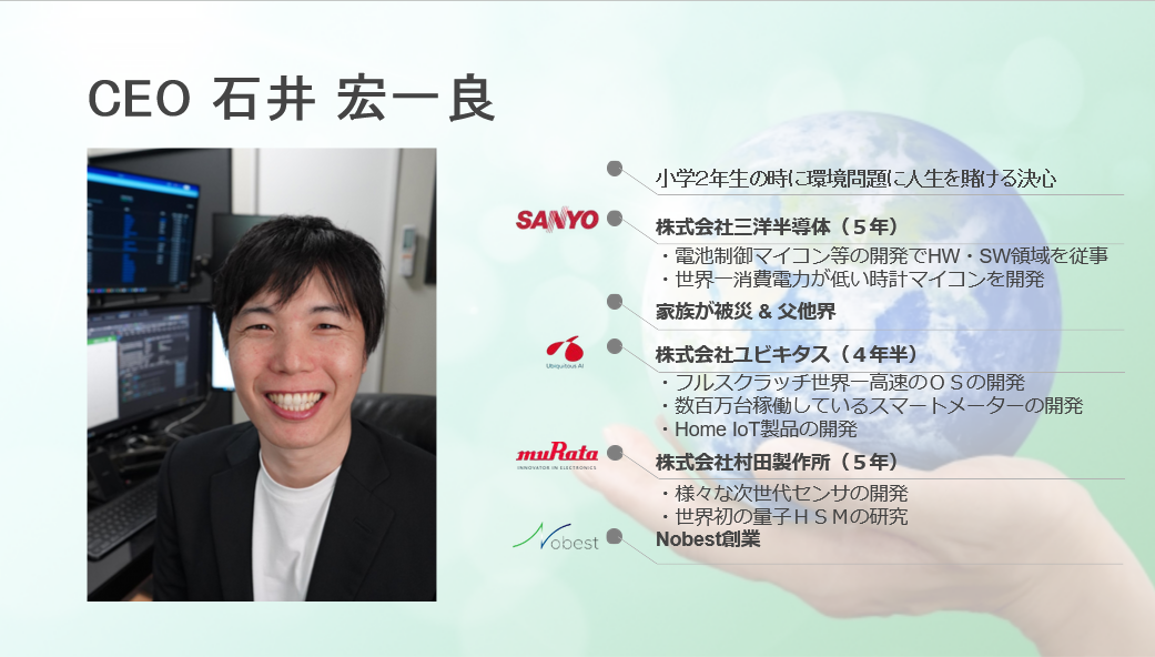 株式会社Nobestは、2022年4月22日(地球の日)に設立した環境系ITスタートアップ企業です。「技術を使って人も自然も救う」というミッションを掲げ、AI、量子計算、IoT技術を活用したゼロエミの完全体である「電気を買わない家」の実現を目指しております。