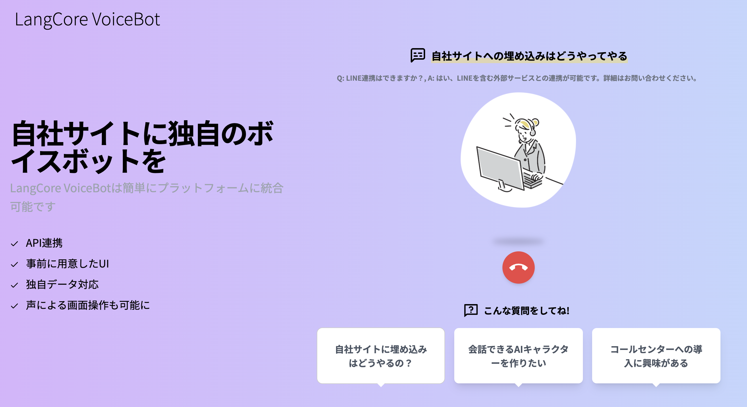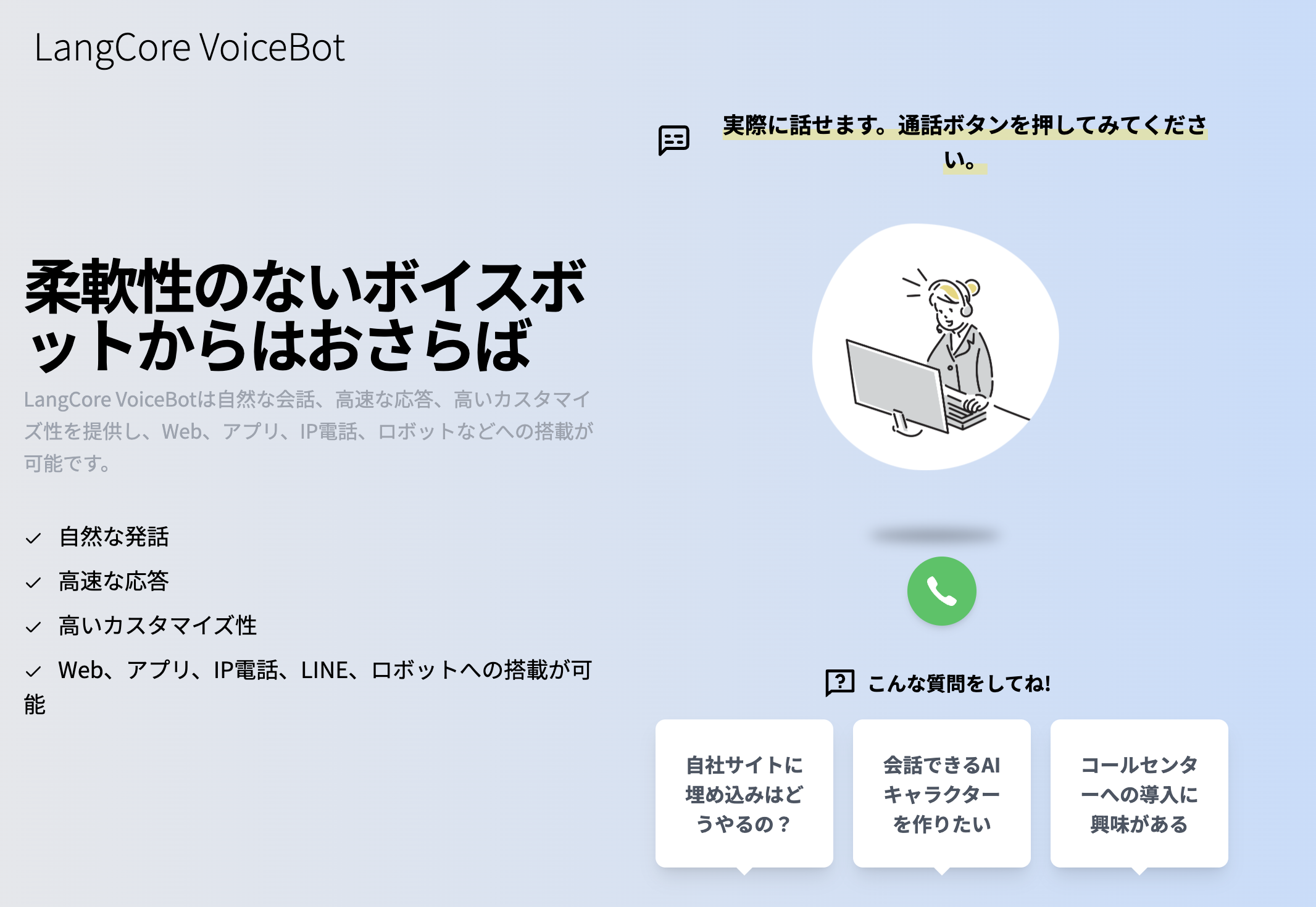 株式会社LangCore(本社:東京都江東区豊洲、代表取締役:北原麦郎)は、ボイスボットをAPIで簡単に組み込める「LangCore VoiceBot」のデモページを本日リリースしました。