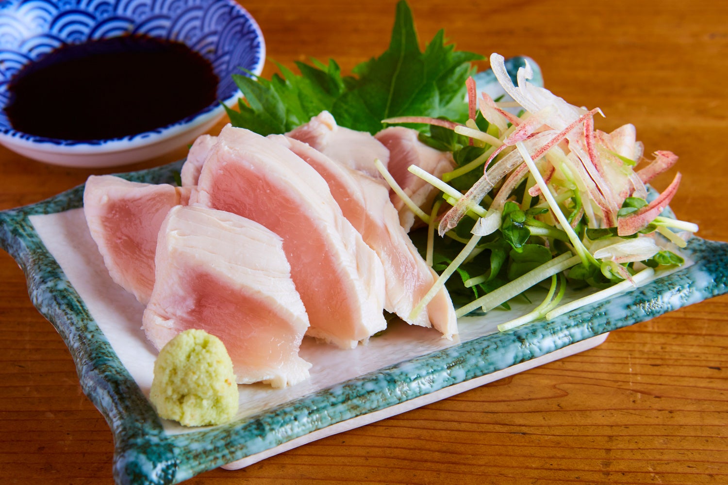 新鮮で旨味のあるささみを湯引きしてレアに仕上げました。