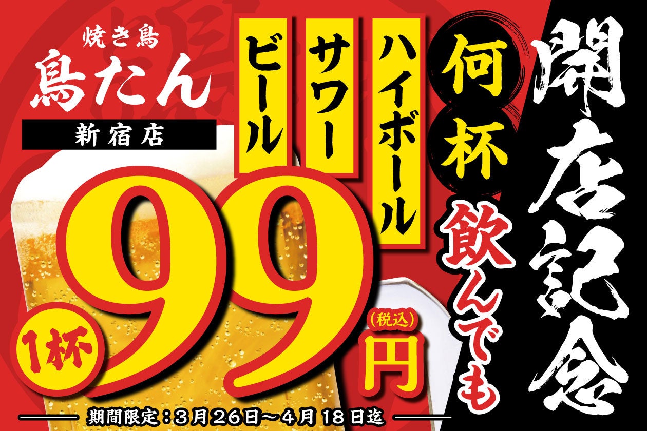 【生ビール・ハイボール・サワーが何杯飲んでも1杯99円】2号店目となる「焼き鳥 鳥たん 新宿店」がオープンを記念して3月26日(火)~4月18日(木)の期間限定で開催