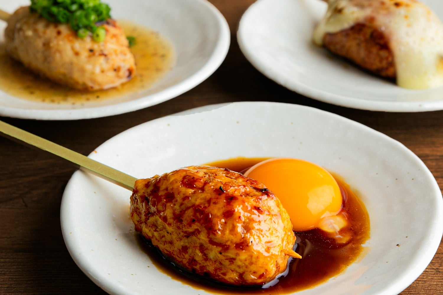 税伝レシピの大玉自家製鶏つくね。香ばしさとジューシーさを持つ自慢の逸品。シンプルな塩やチーズ・塩ねぎレモンなどのバリエーションも!