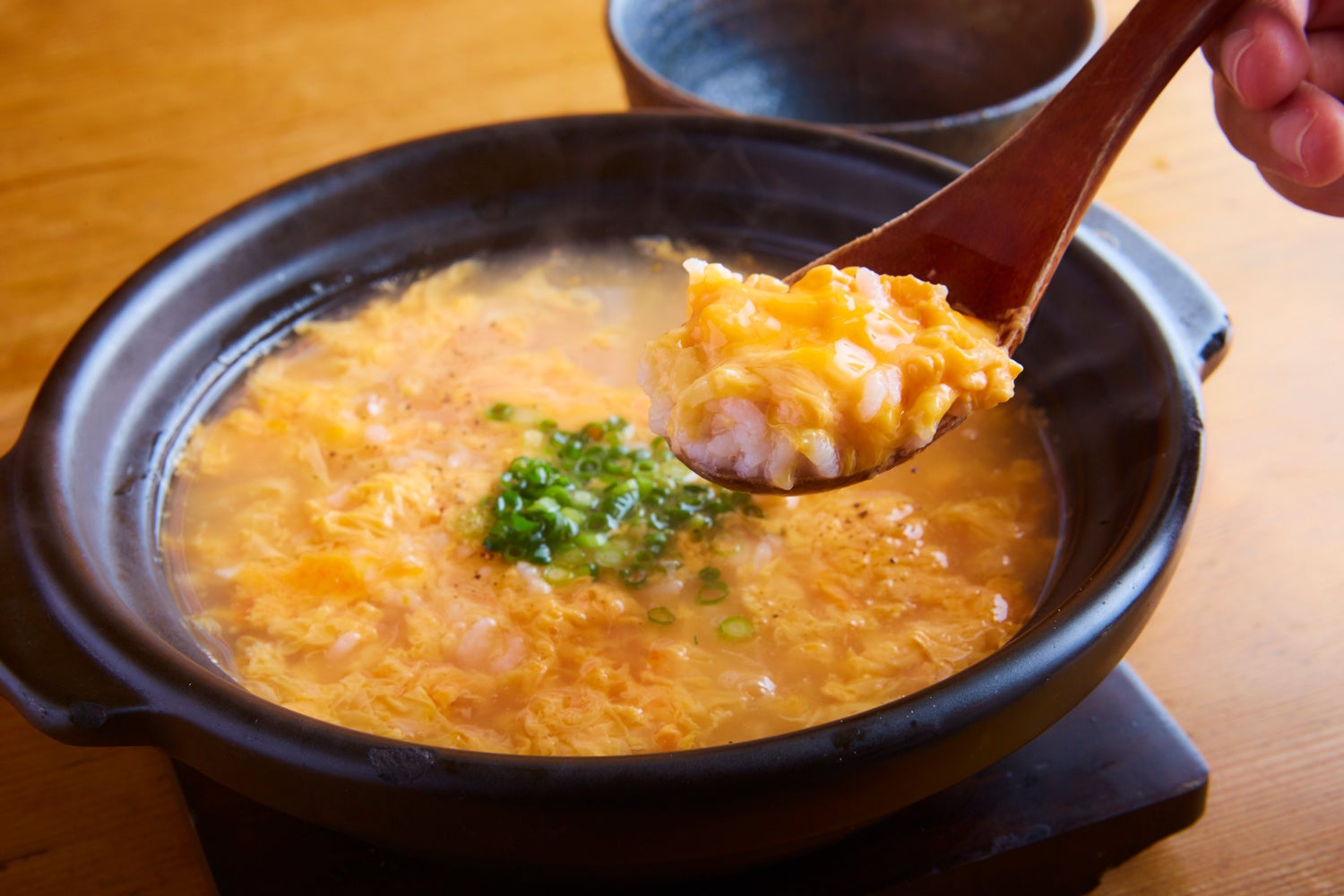鶏の旨みを最大限に抽出した黄金鶏スープとブランド卵である「赤玉頑固」の濃厚な旨みを絡ませて作り上げた雑炊は「鶏」を凝縮した一品!