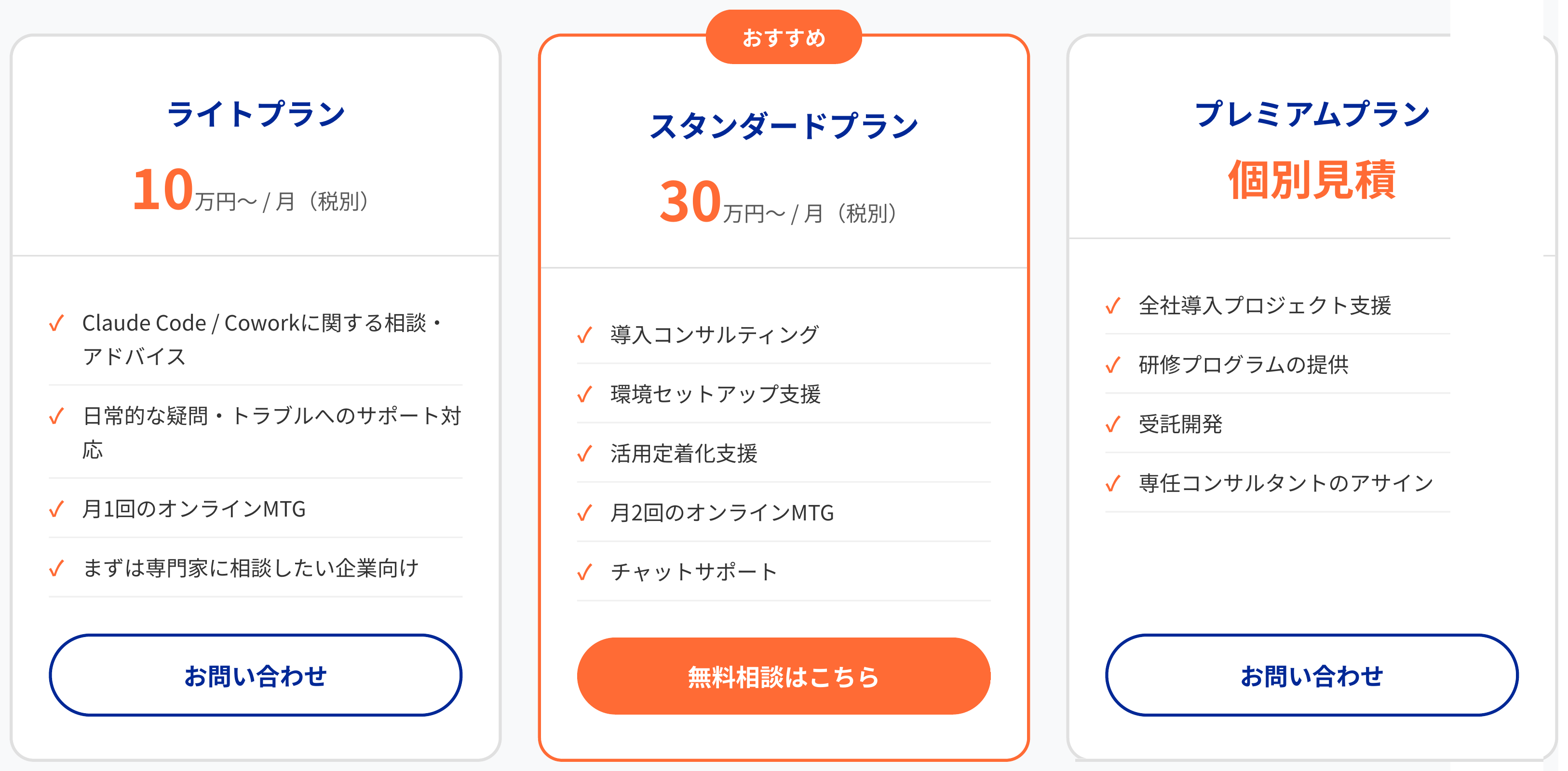 初期費用0円、月額10万円〜の定額制で安心して始められます。まずは相談だけのライトプランから、本格導入を伴走支援するスタンダード・プレミアムプランまで、フェーズに合わせて必要な支援を選べます。