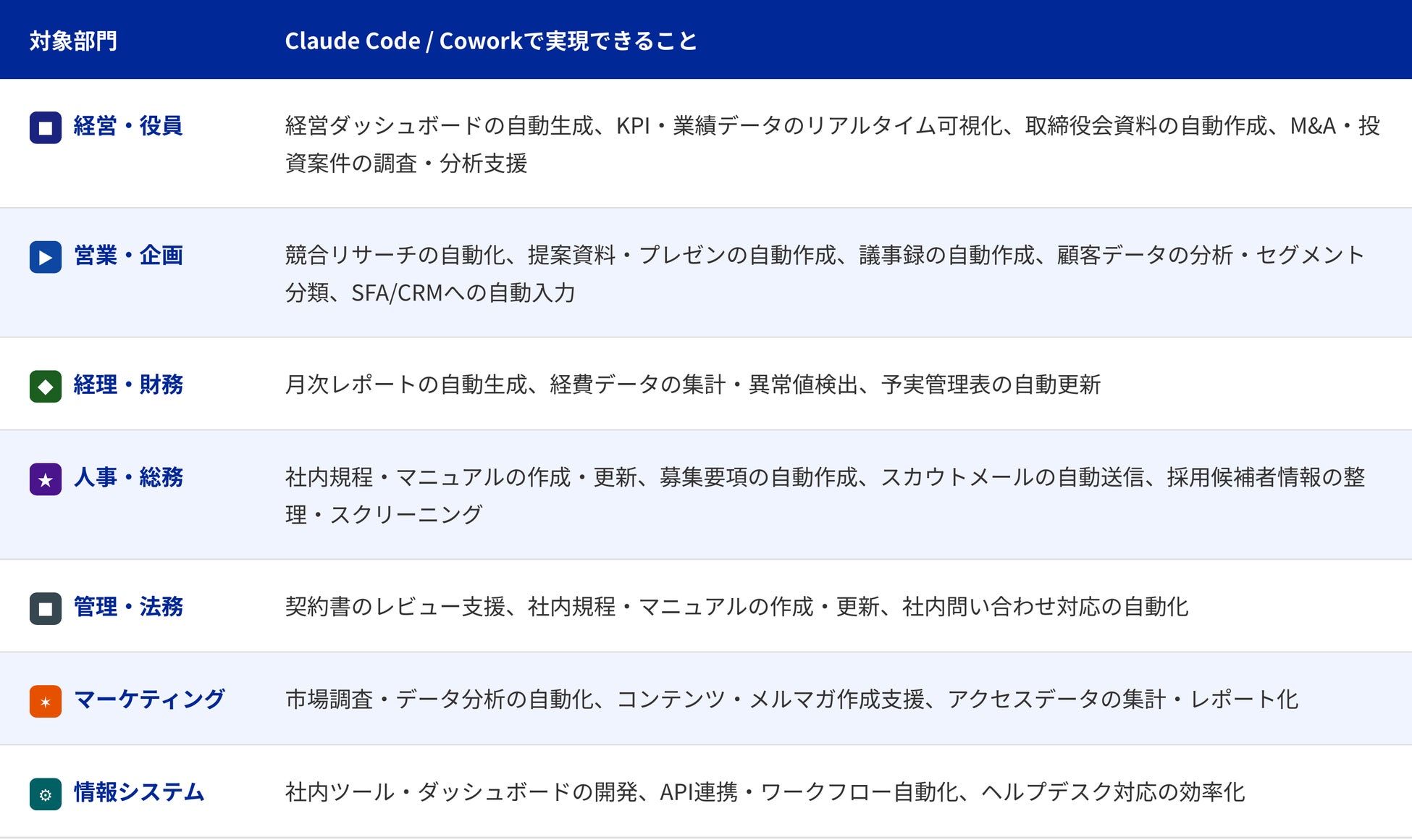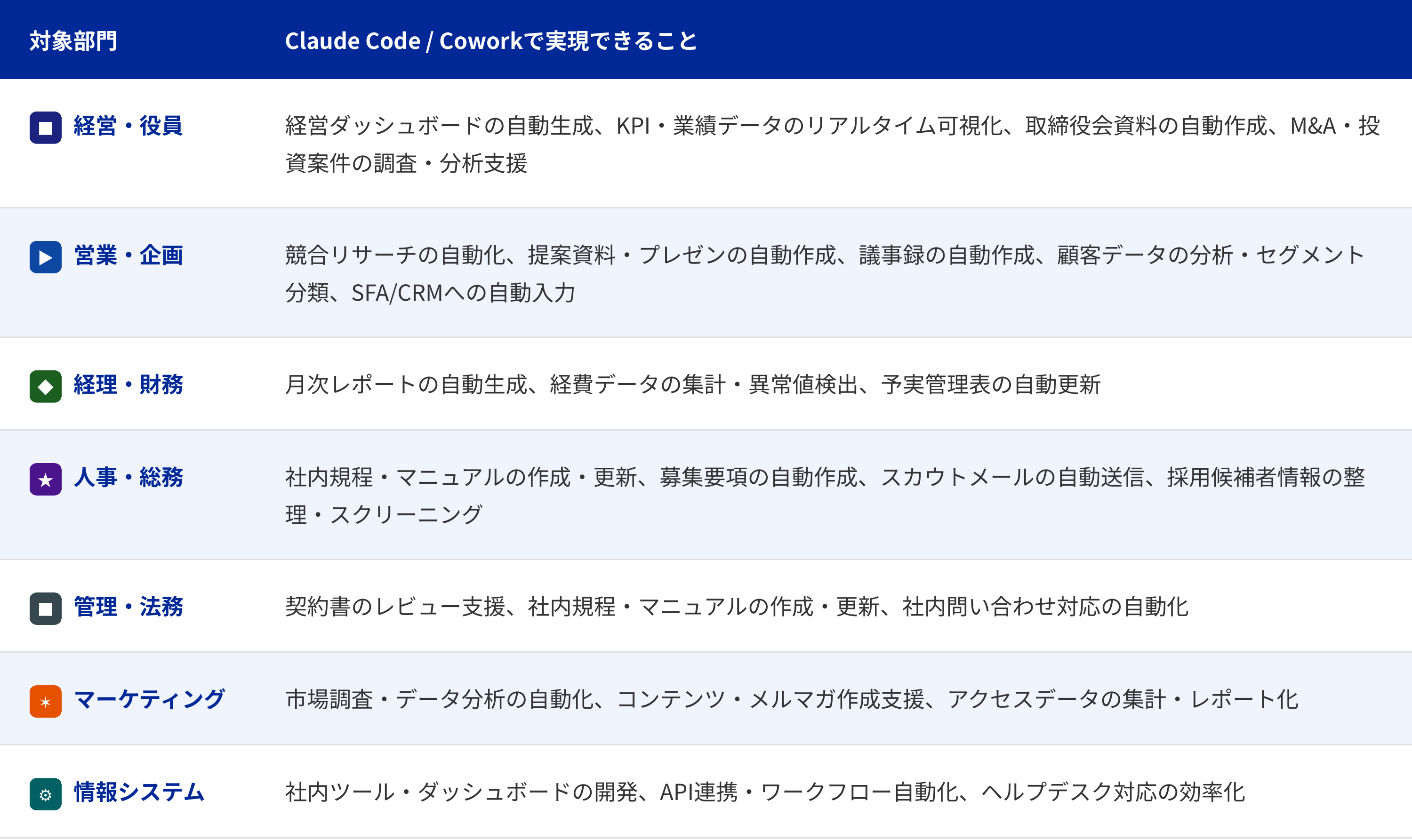 Claude Code / Coworkを導入することで、エンジニアに限らず、経営層から現場まで企業のさまざまな部門で業務改善を実現できます。以下はその一例です。
