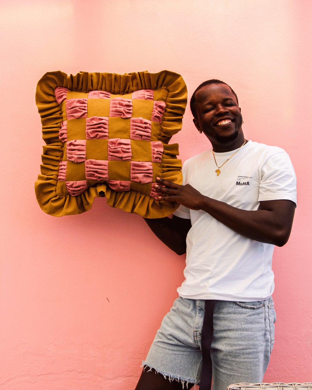 同氏は、独裁政権下の祖国にて、13歳から学校へ通わずに一家の大黒柱として洋服屋で働き、家庭を養いながら、色や生地の組合せセンスを培った。その後、イタリアへ亡命。ナポリの工房勤務を経て、コロナ禍で手縫いクッション製作を開始。移民の雇用創出にも力を入れており、移民が自立的スキルを身に着け、現代社会において明るい未来を築いていく事が出来るよう活動中。