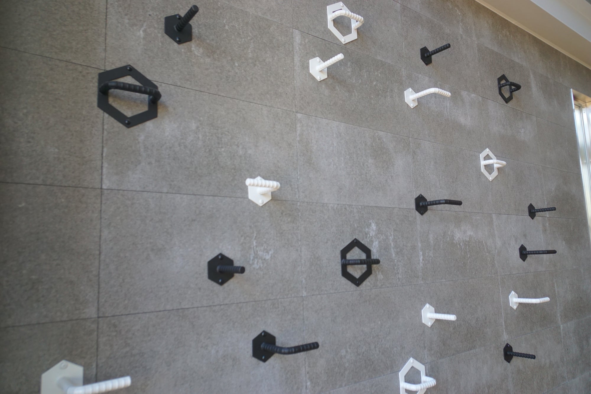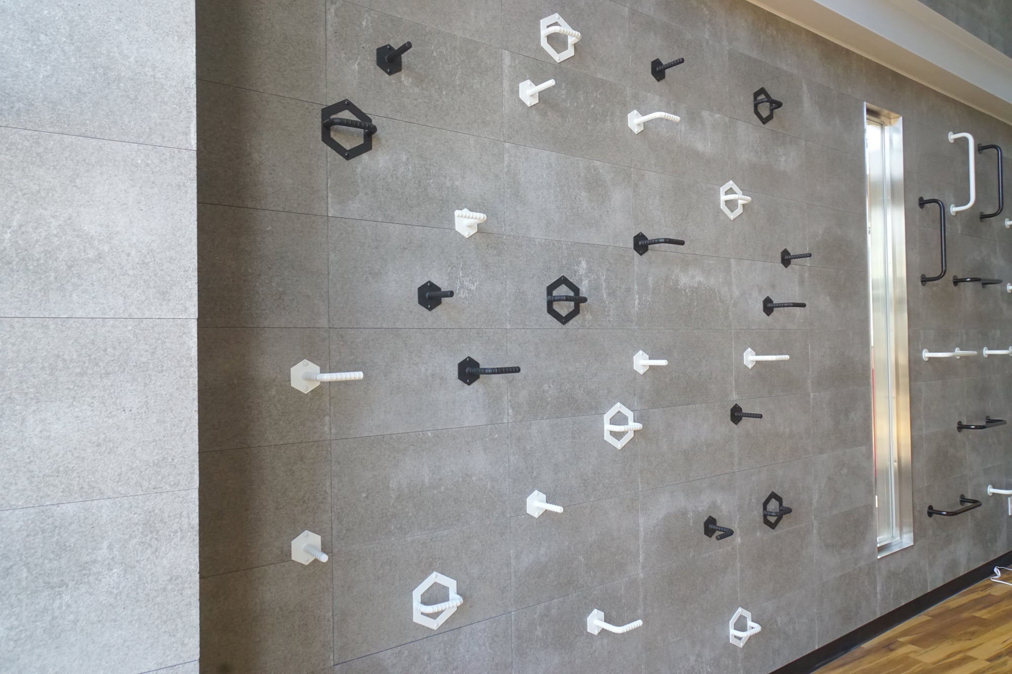 『Athletic Series(アスレチックシリーズ)』の中で最も売れている「DECO シリーズ」は大人から子どもまで、お家で手軽にボルダリングのような運動ができるということで人気の製品でしたが、可愛らしいデザインが人気な反面、ヴィンテージテイストなどのシックなデザインのお家には採用しにくいという欠点がありました。『D-Rock』は鉄筋コンクリートの芯材として使用されている異形丸鋼をそのまま使用しているため、素材感を大切にしているそれらのテイストにもしっかりと馴染みます。また異形丸鋼の表面の凹凸は滑り止めの役割となっているのも特徴です。子どもだけではなく、成人男性が使用しても問題ない強度があるので、日々のトレーニングに使用するのもおすすめです。