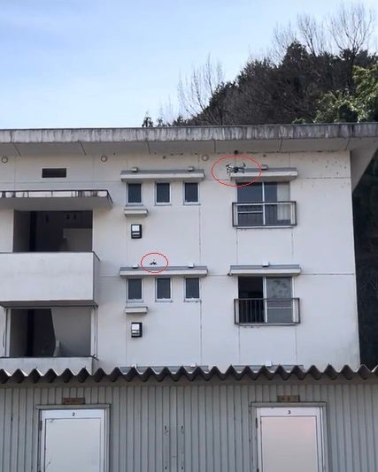 外観診断およびベランダからの要救助者捜索を目的に、国産ドローン「SOTEN(蒼天)」を飛行させ、建物の外観にひび割れや傾きなどの損傷がないか、また、ベランダ越しに取り残されている要救助者がいないかをチェックし、3階建ての建物12戸のうち2階および3階の計2戸を特定しました。この捜索は、人員2名で約10分の飛行で行えることを確認しました。