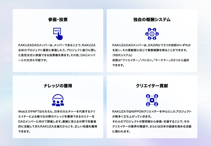 DAOメンバーになると、RAKUZAが関連するプロジェクトの意思決定に投票が可能となり、NFTやWeb3.0はもちろん、他にもクリエイターが開催するセミナー参加、またメンバー同士でプロジェクトを組成して、RAKUZA NFTマーケットプレイスを利用したNFTの販売プロジェクトの立ち上げなどもできる用に機能開発を予定しています。その他DAO内でのコミュニケーション機能など、コミュニティとしての機能も実装予定です。