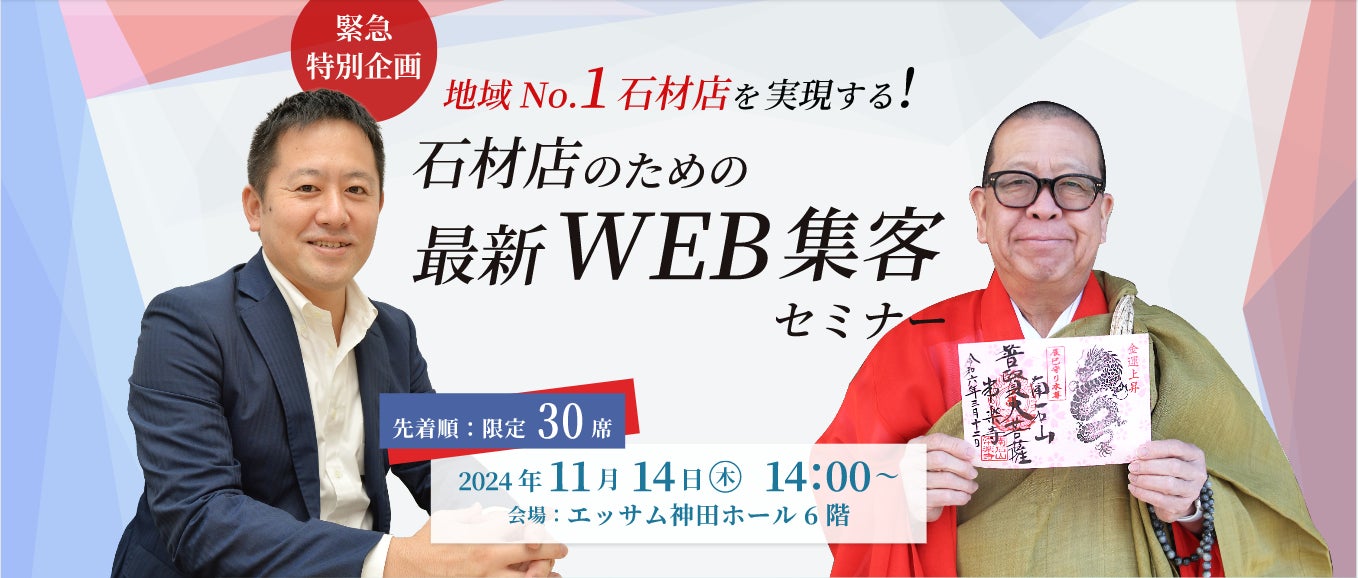 株式会社GIコンサルティングパートナーズ(本社:東京都千代田区、代表者:赤澤宣幸)と株式会社慈眼(本社:埼玉県秩父市、代表者:柴原幸保)は、2024年11月14日(木)にエッサム神田ホール1号館6階・中会議室1にて、参加費無料のオフラインセミナー「地域No.1石材店を実現する!石材店のための最新WEB集客セミナー」を開催いたします。