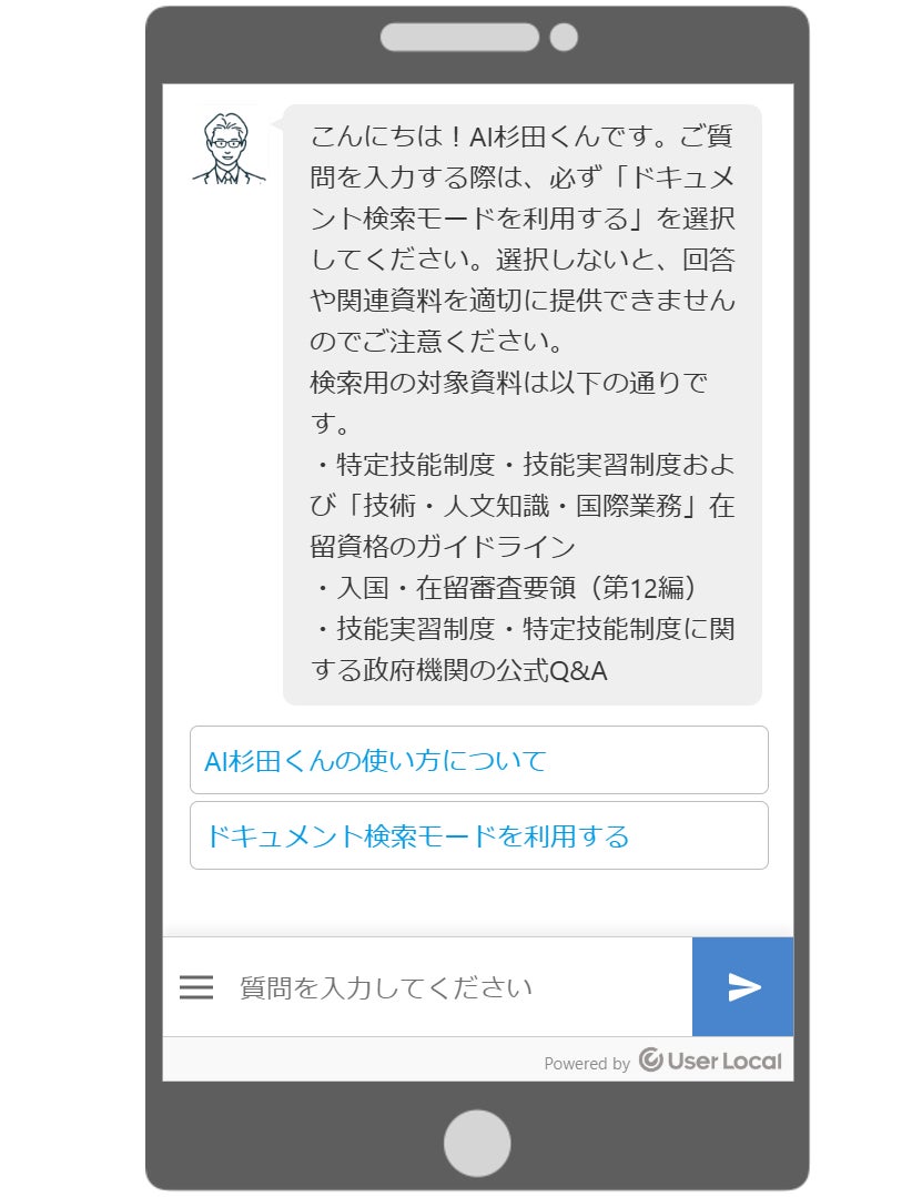 「AI杉田くん」は、主な機能として「ドキュメント検索モード」と「ChatGPTモード」を搭載しています。「ドキュメント検索モード」では、外国人雇用に関する質問に自動回答し、根拠となる関連資料も提示します。また、必要に応じて「ChatGPTモード」への切り替えも行われます。