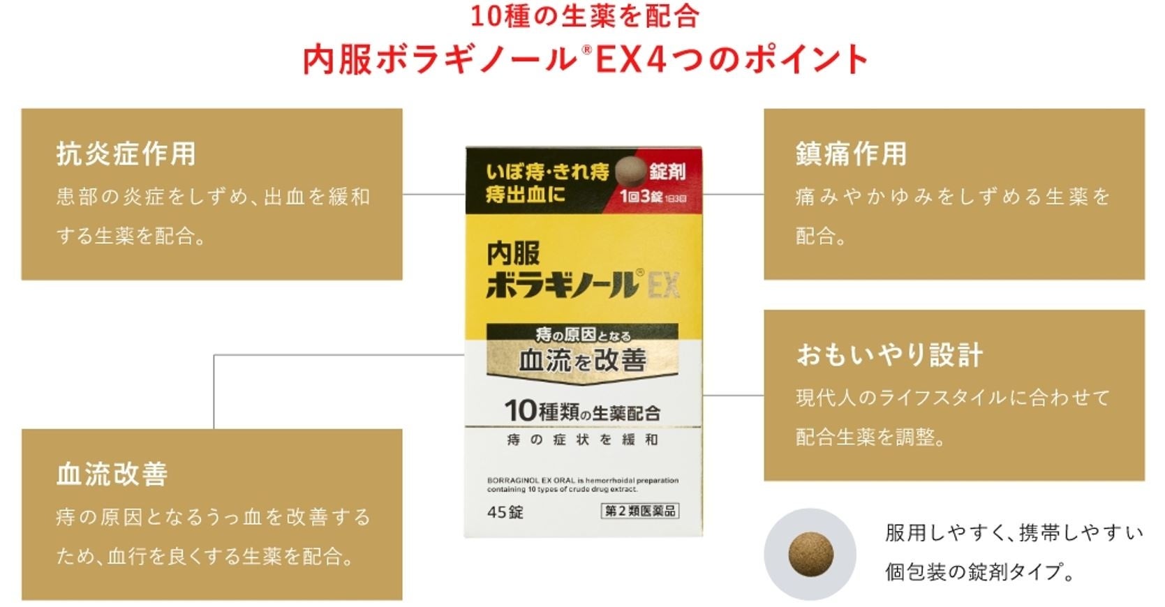 「ボラギノール®」痔疾用薬の新製品として「内服ボラギノール®EX」が新登場。10種類の生薬の力で、今ある痔の症状の対処と原因の改善、その両方にアプローチ。