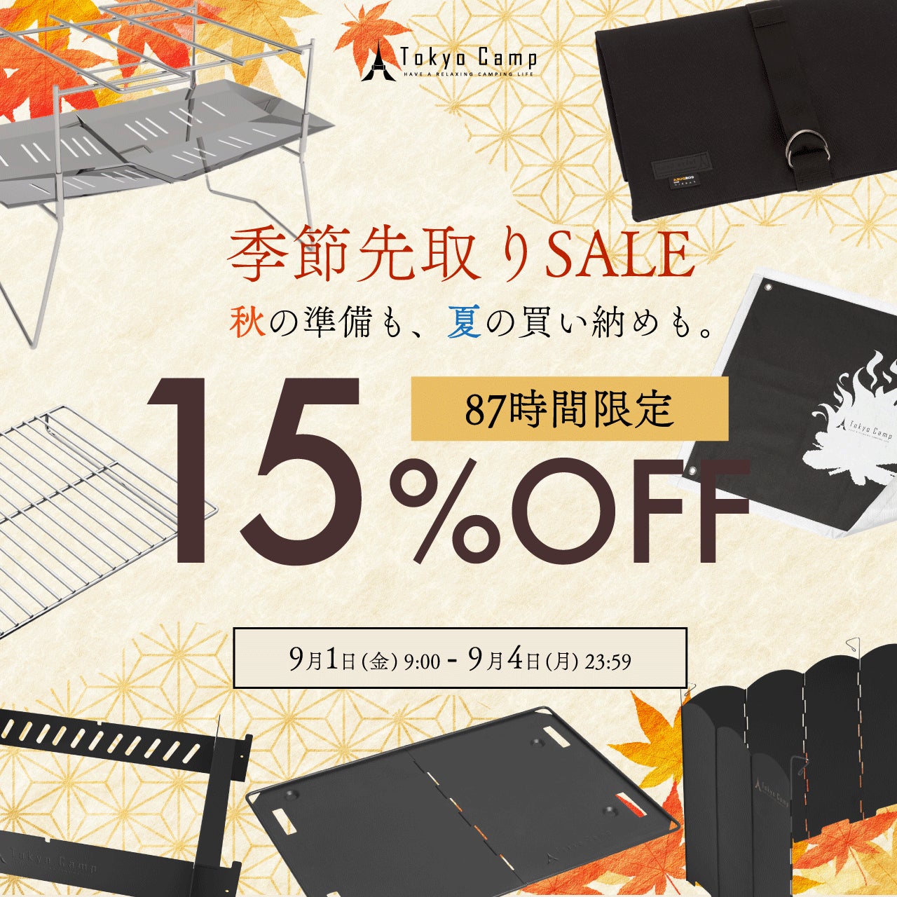 2023年9月1日(金)9:00から9月4日(月)23:59まで開催されるAmazon「季節先取りSALE」では、TokyoCamp焚き火台が15%OFFで販売されます。