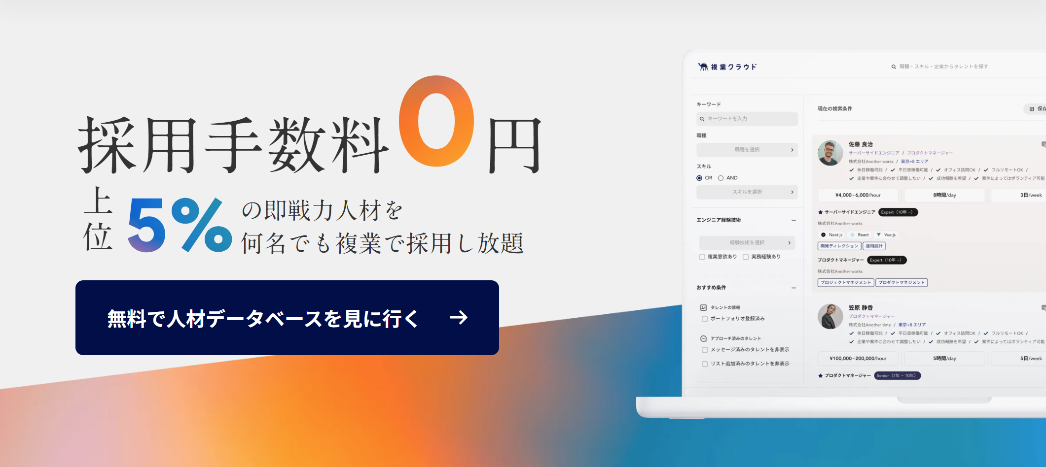 アナザーワークスは、国内最大の複業・業務委託特化型マッチングプラットフォーム「複業クラウド」を運営しています。複業クラウドは、採用手数料0円で、即戦力複業・フリーランスの業務委託人材(約65,000名)を採用できるプラットフォームです。