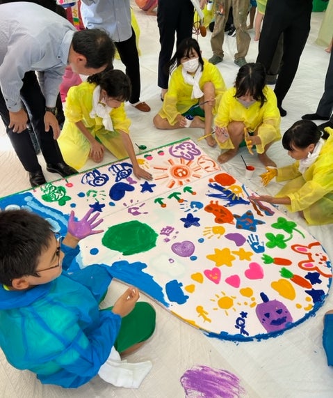 10月6日(金)には、「なみえ創成小学校」の子どもたち(3年生、5年生)によって、「なみえまちのミライ」をテーマに青い海や空、美しい花やかわいい動物など、自由闊達にアイデア溢れる色とりどりのペインティングが施されました。