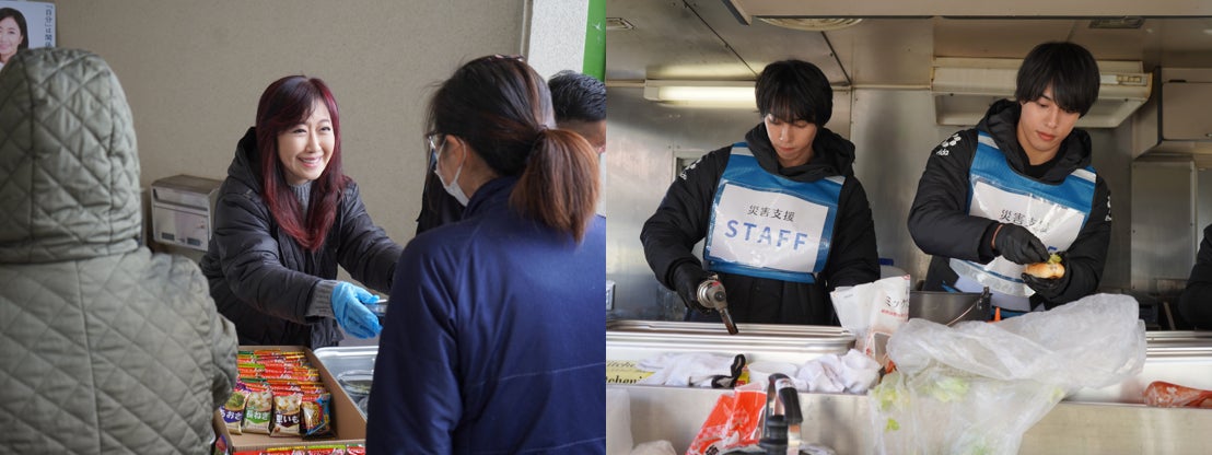 この度、2月27日(火)に、アンバサダーの伍代夏子氏が石川県珠洲市を訪問し、生涯学習センターにて、一卵性三つ子のインフルエンサー 佐藤三兄弟の長男 綾人氏、三男 嘉人氏とともに炊き出しも行いました。